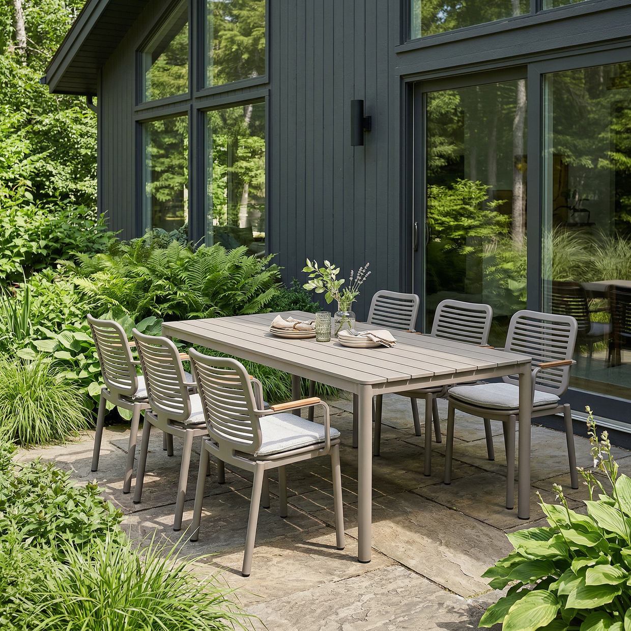 Runt bordet står de bekväma Valbonne karmstolarna, som kombinerar elegant formspråk med hög sittkomfort. De mjukt rundade linjerna och luftiga designen skapar en inbjudande känsla, medan armstöd med teakdetaljer tillför en varm och exklusiv touch. Stolarna är tillverkade i vädertålig aluminium och levereras med en bekväm sittdyna i slitstarkt olefintyg – perfekt anpassad för utomhusmiljöer.