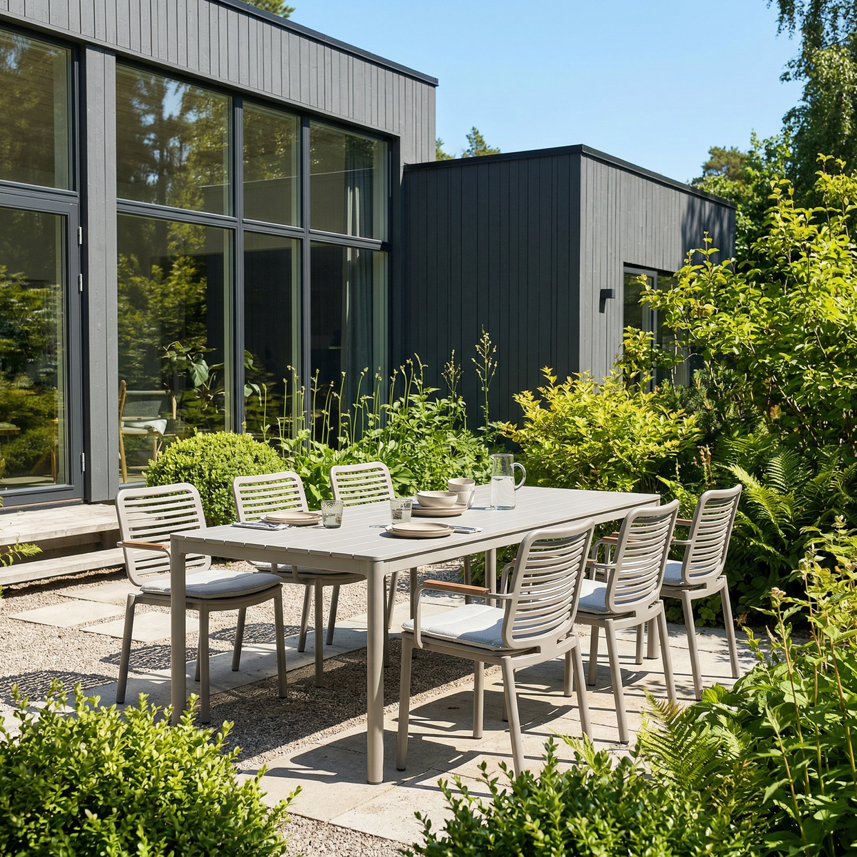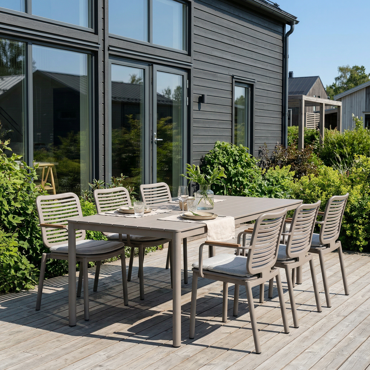 Låt uteplatsen bli hemmets naturliga samlingspunkt med denna smakfulla matgrupp bestående av Antibes matbord och Valbonne karmstolar i en harmonisk beige kulör. Kombinationen ger ett enhetligt och genomtänkt uttryck som andas modern skandinavisk design.