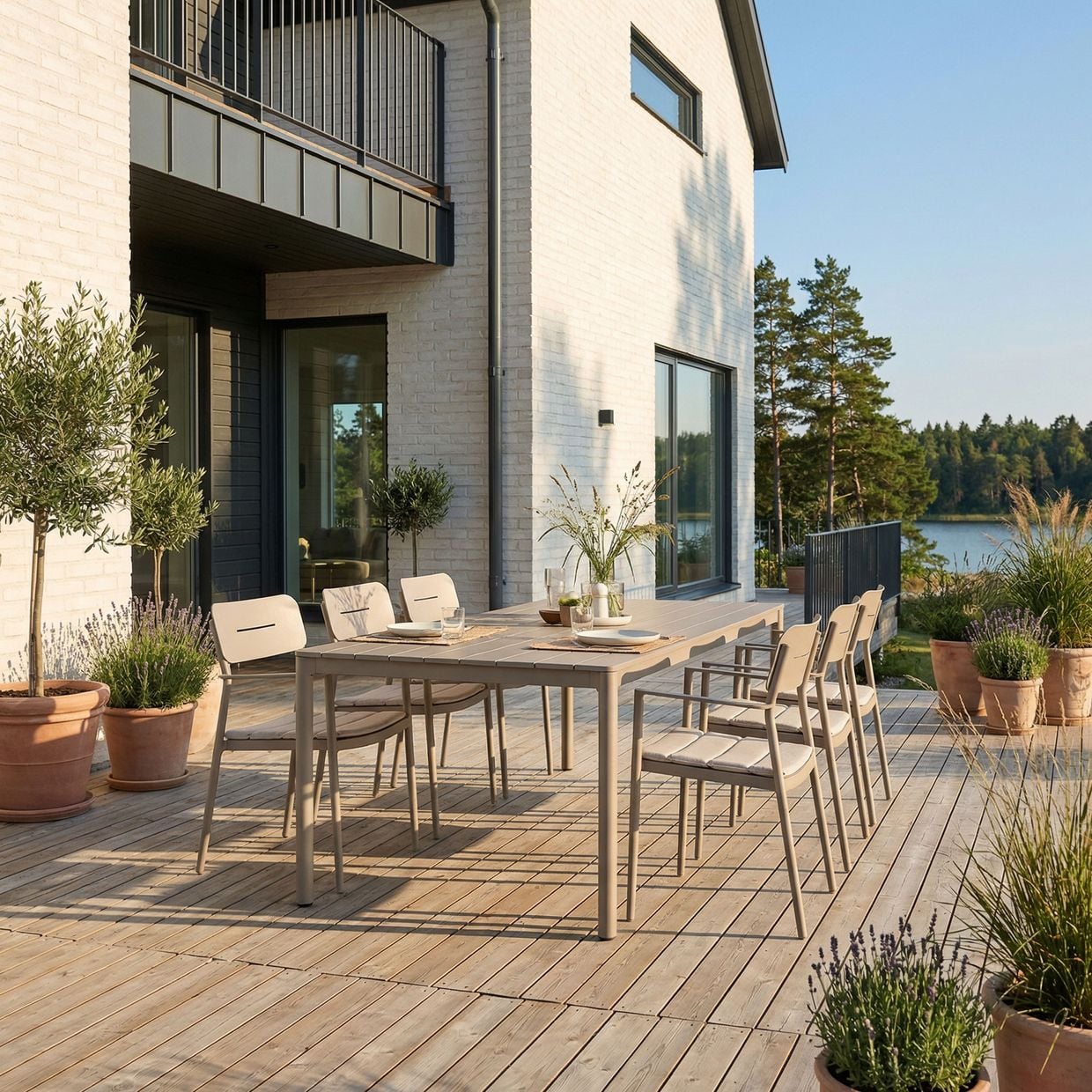 Lyft din uteplats med Antibes matgrupp – en stilren kombination av Antibes matbord och Lodes karmstol i vår egna signaturkulör Nordisk beige. En varm och mjuk ton som är framtagen för att harmoniera med våra övriga möbler och skapa en enhetlig, modern helhet i din utemiljö.