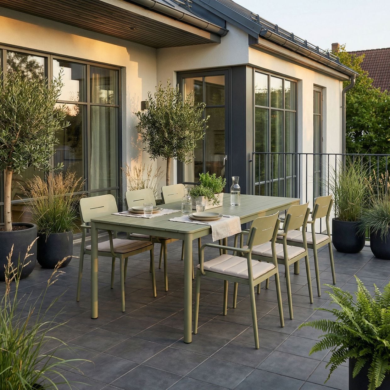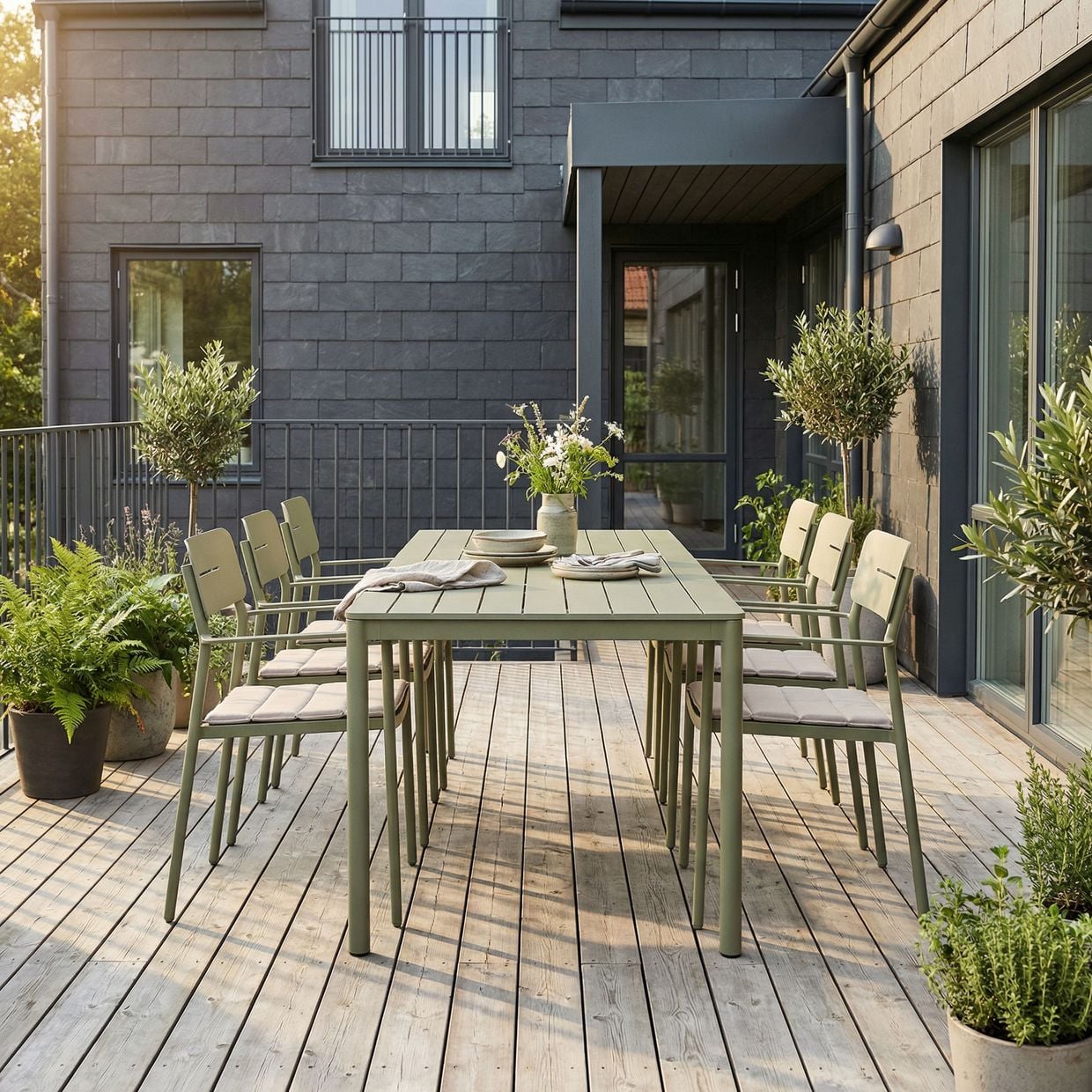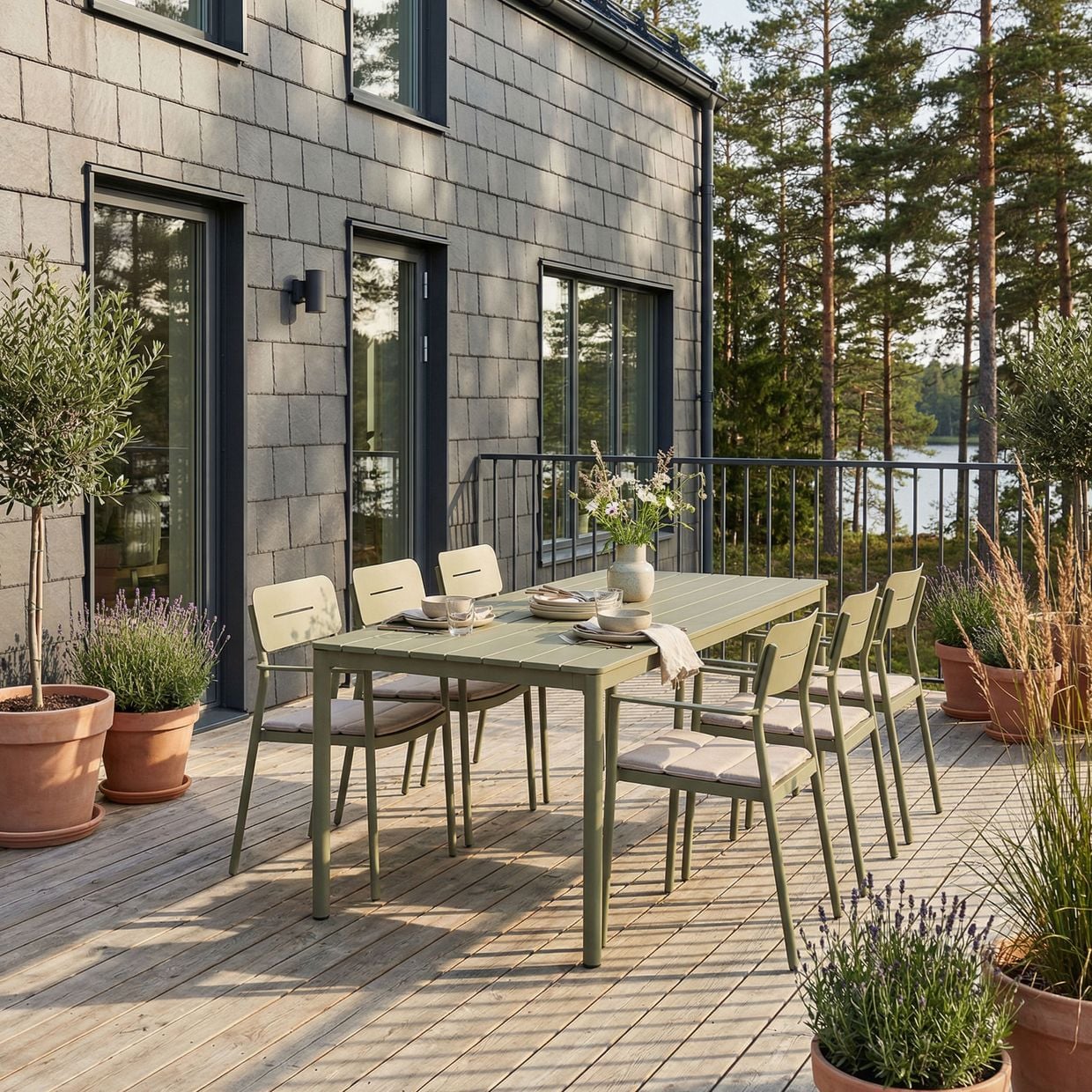 Lyft din uteplats med Antibes matgrupp – en stilren kombination av Antibes matbord och Lodes karmstol i vår egna signaturkulör Nordiska Grön. En naturnära och harmonisk ton som är framtagen för att smälta in i omgivningen och enkelt kunna kombineras med våra övriga möbler i samma kulör.