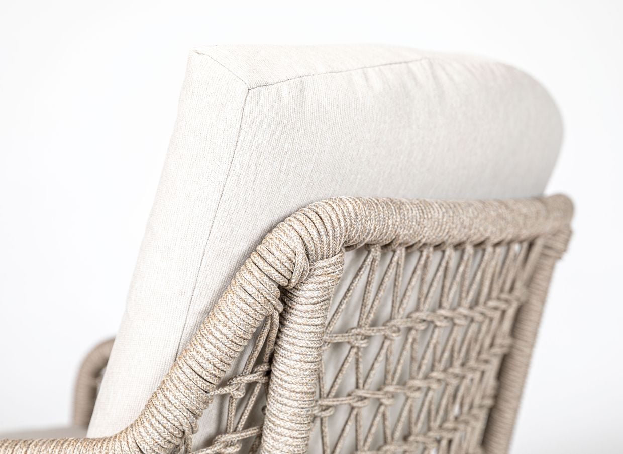 De dekorativa sidorna och ryggen är vackert flätade i olefinrep, vilket ger stolen en luftig och modern karaktär. Kombinationen av det mjuka tyget och det strukturerade repet skapar en balanserad design där komfort möter hantverkskänsla.