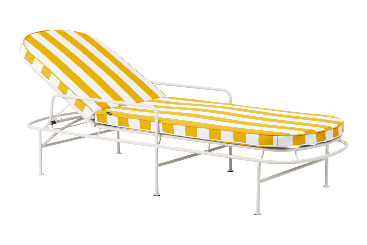 Dröm dig bort till Franska rivieran med Arts – en solsäng med tillhörande sidobord som förenar elegans och komfort. Böjda metallribbor, dekorativ stålram och randiga färgade tyger ger tidlös stil och avslappnad charm till varje utomhusmiljö. Design: Johan Skoogh.