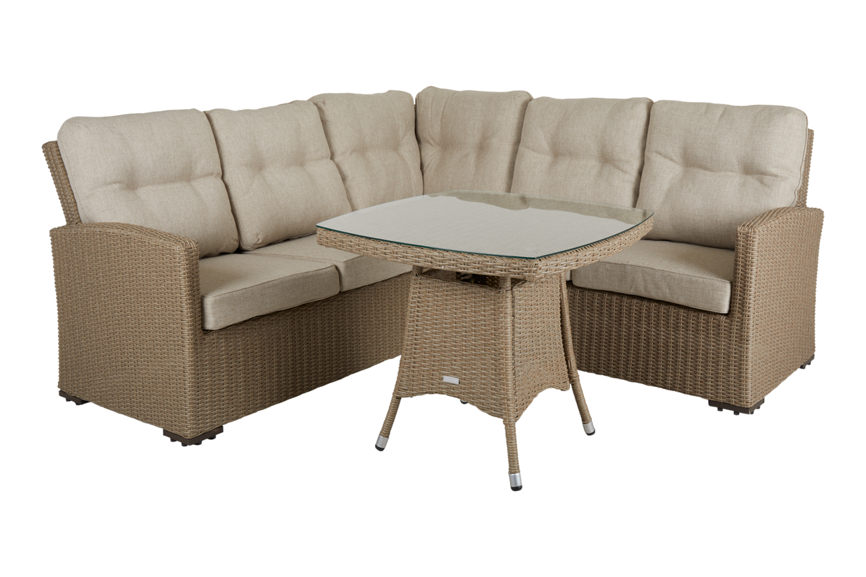 En nätt soffgrupp i konstrotting som passar perfekt för det mindre utrymmet. Den bekväma matgruppshöjden och de tåliga dynorna i olefintyg gör det enkelt för både liten och stor att njuta av fikan tillsammans.
