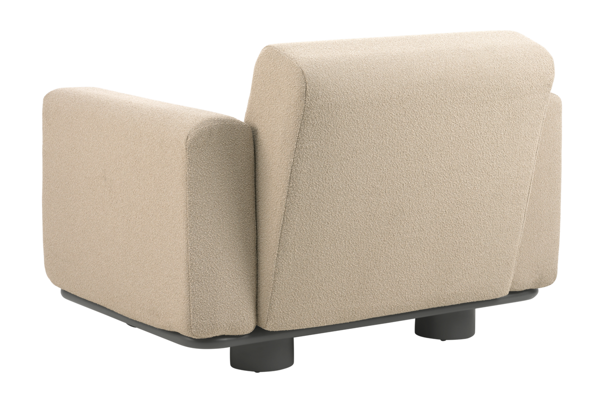 Bolster förenar inbjudande komfort med uttrycksfull design. De helklädda formerna, generösa dynorna och de kraftiga benen ger serien sin unika karaktär, medan den robusta aluminiumramen i antracit säkrar lång hållbarhet. Det vattenavvisande TPU-tyget gör soffan vädertålig. Dynorna finns i vårt Teddy-tyg, i färger som förhöjer känslan av en exklusiv utelounge. Dynorna är enkla att ta av och förvara. Bolster suddar ut gränsen mellan inne och ute – känslan av en innesoffa skapad för livet utomhus. Design: Johan Skoogh.