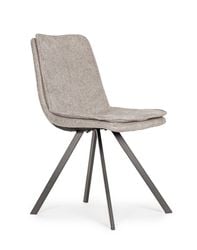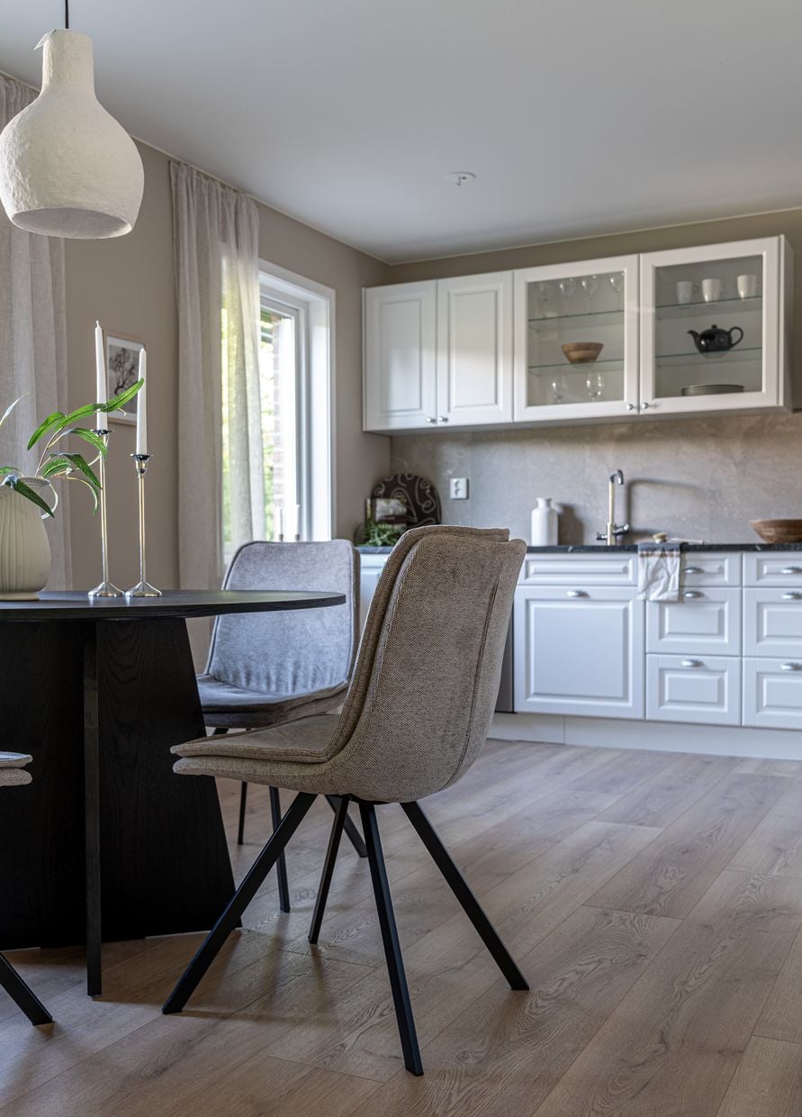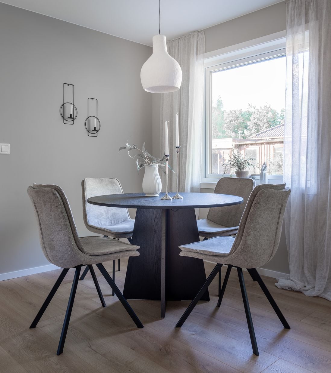 De fyra matchande stolarna är klädda i ett mjukt, neutralt tyg som harmonierar perfekt med rummets ljusa och luftiga atmosfär. De svarta benen ger en elegant kontrast som kompletterar helhetsintrycket.