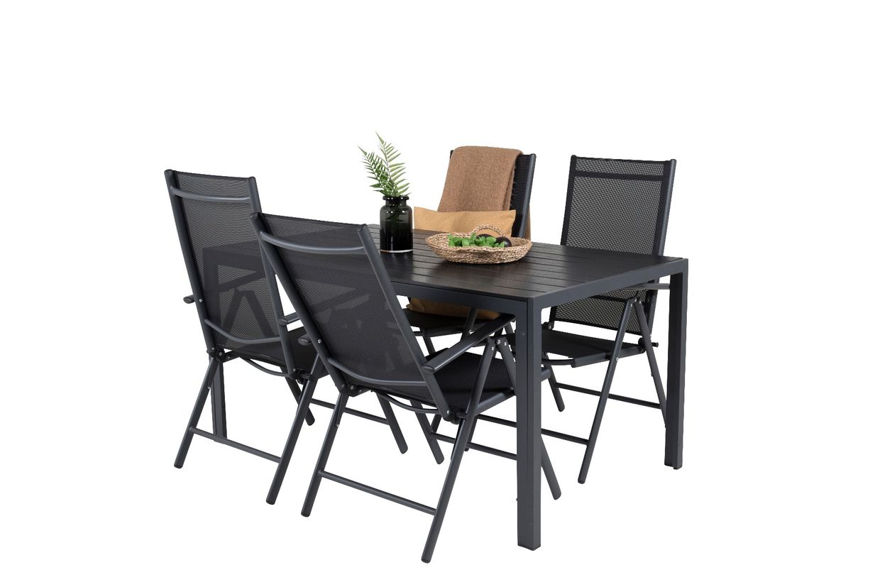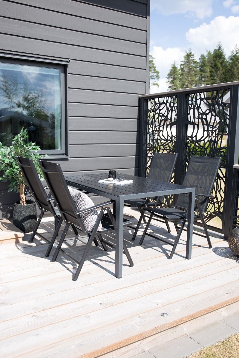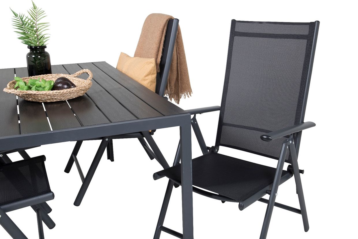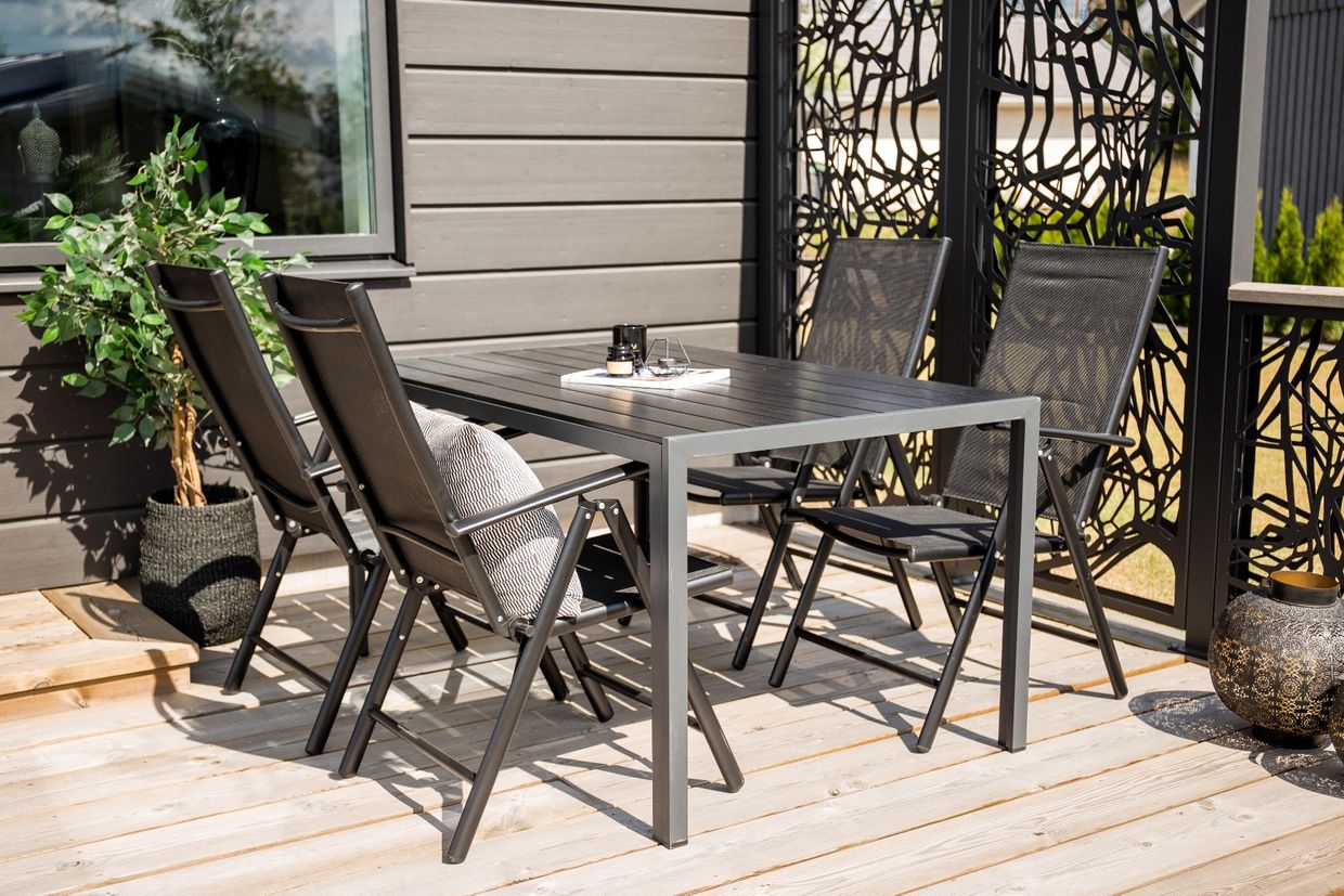 Matbord i svart med aluminiumstomme och bordsskiva i aintwood. Matchande positionsstolar som är ställbara i fem olika lägen.