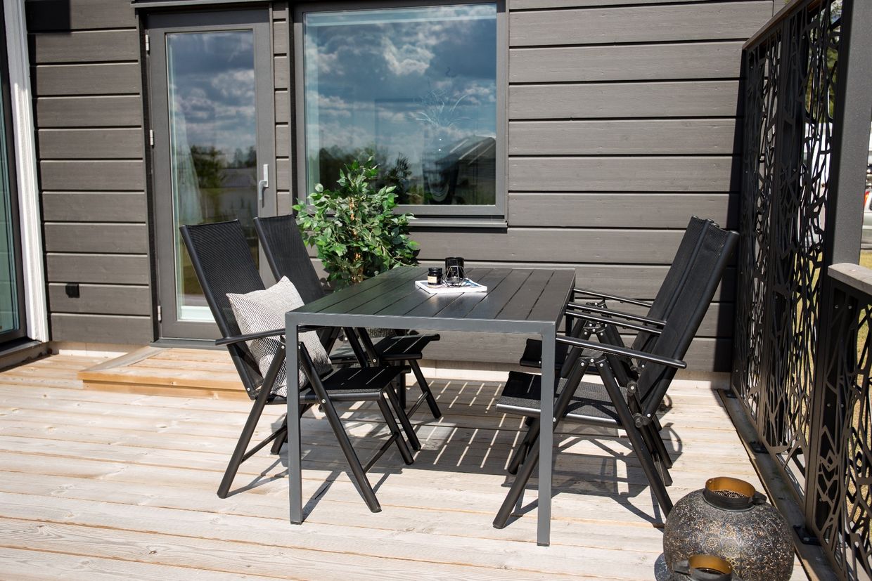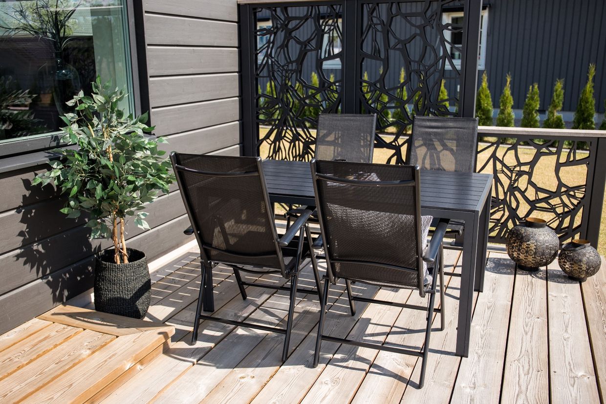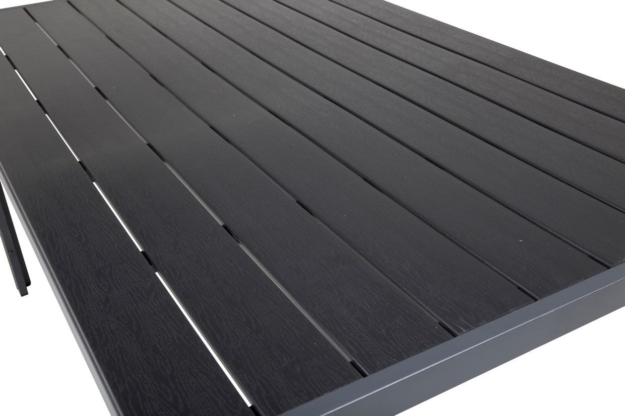 Matbord i svart med aluminiumstomme och bordsskiva i aintwood. Matchande positionsstolar som är ställbara i fem olika lägen.