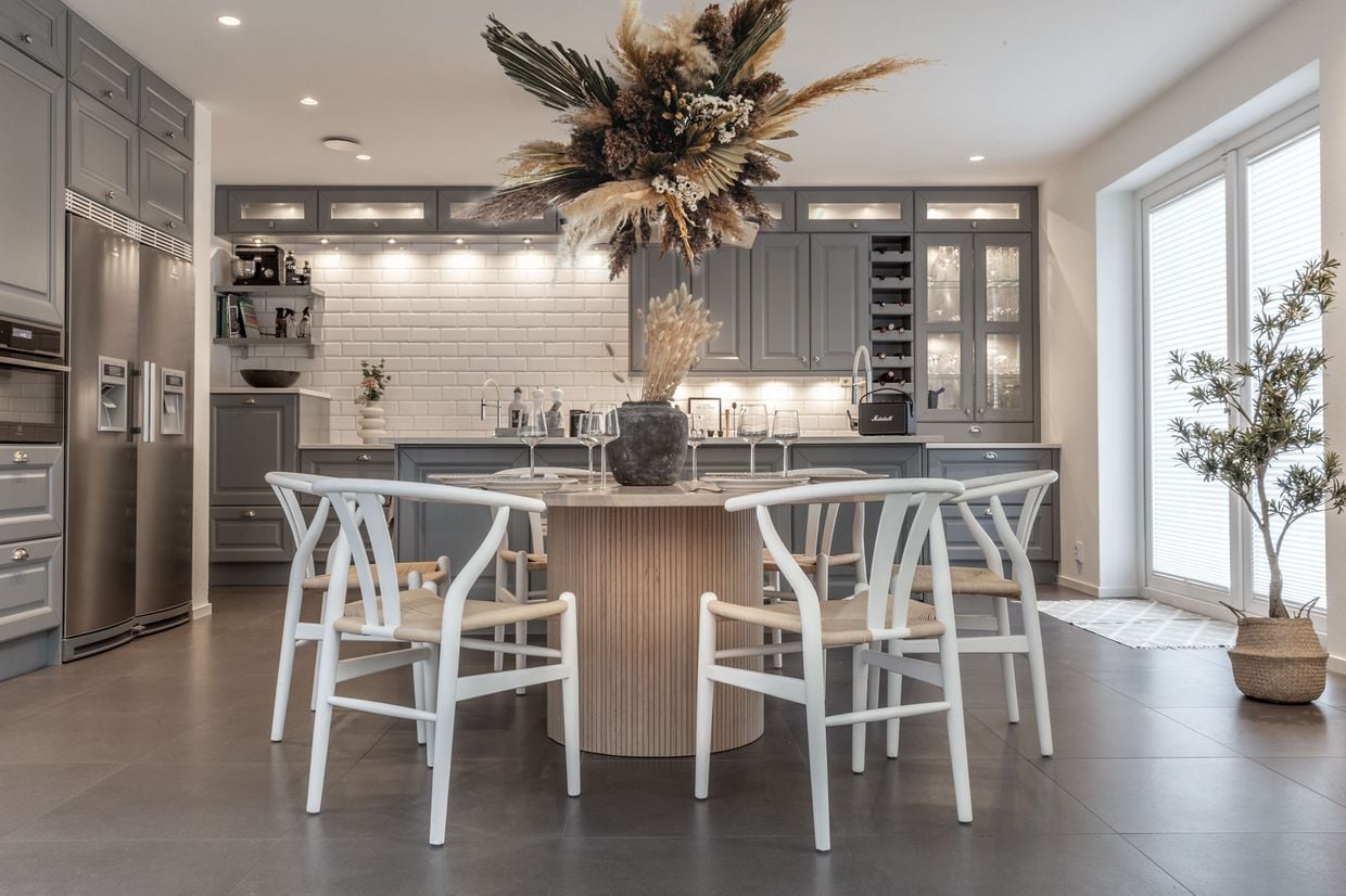 Matgrupp med Circle matbord 150cm och 6st Oskar stolar. Matbordet har en pelarfot med snygga träpaneler i massiv ek. Materialet på bordsskivan är MDF och ekfanér. Klassisk stol med snygg y-design i ryggen. Sitsen är gjord av korgsnöre.