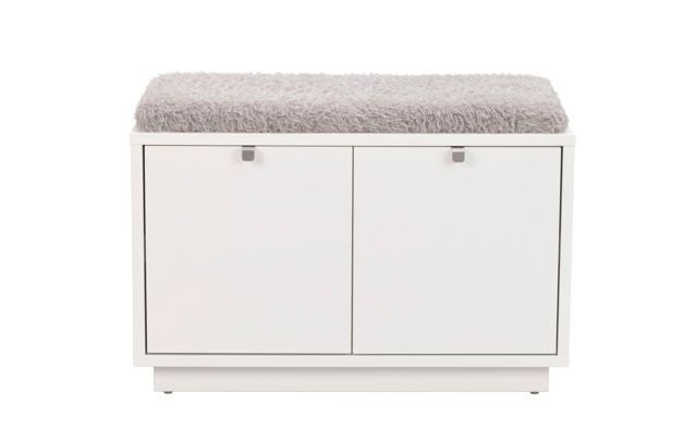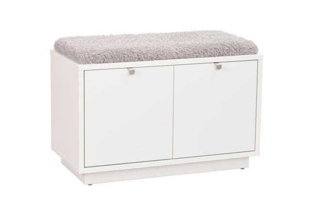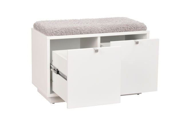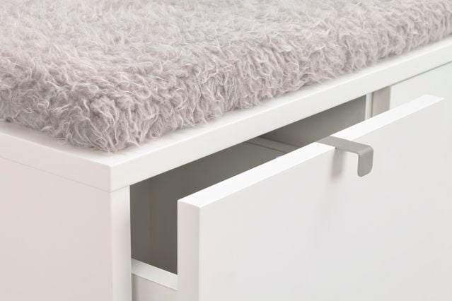 Confetti sittbänk i vitlackad MDF med dyna i fårskinnsimitation. Praktisk och stilren sittbänk med två rymliga lådor som tar hand om förvaringen. Ingår i hallserien Confetti.
