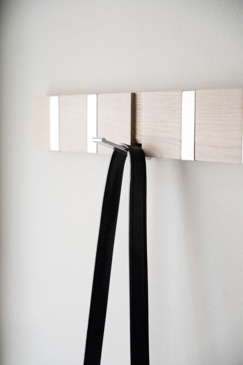 Confetti klädhängare i massiv vitpigmenterad ek. Sex stilrena och utfällbara metallkrokar. Klädhängaren ingår i hallserien Confetti.