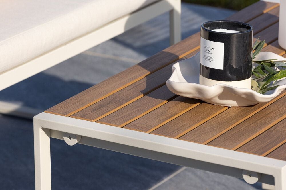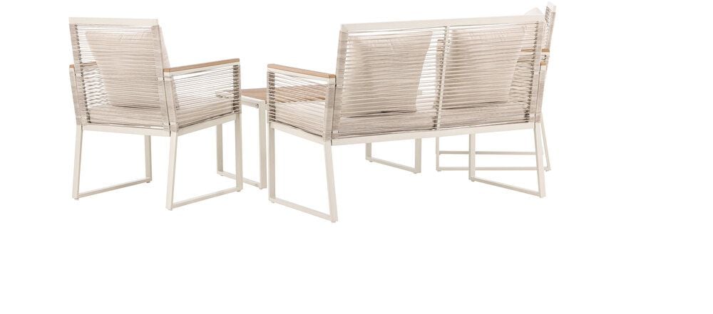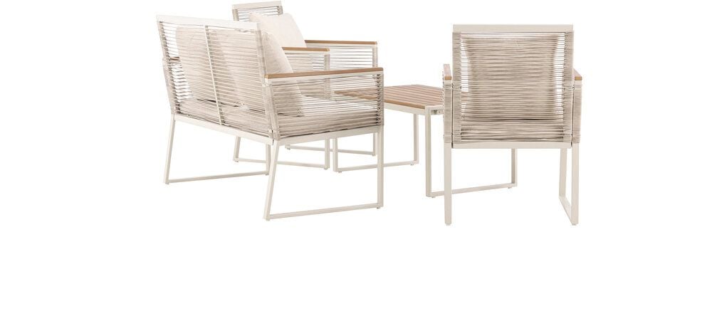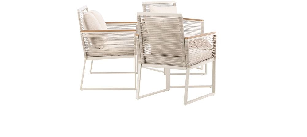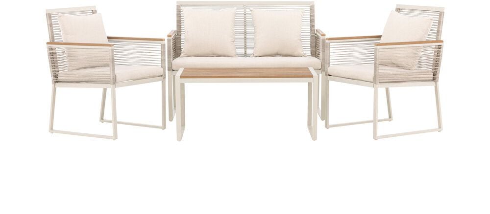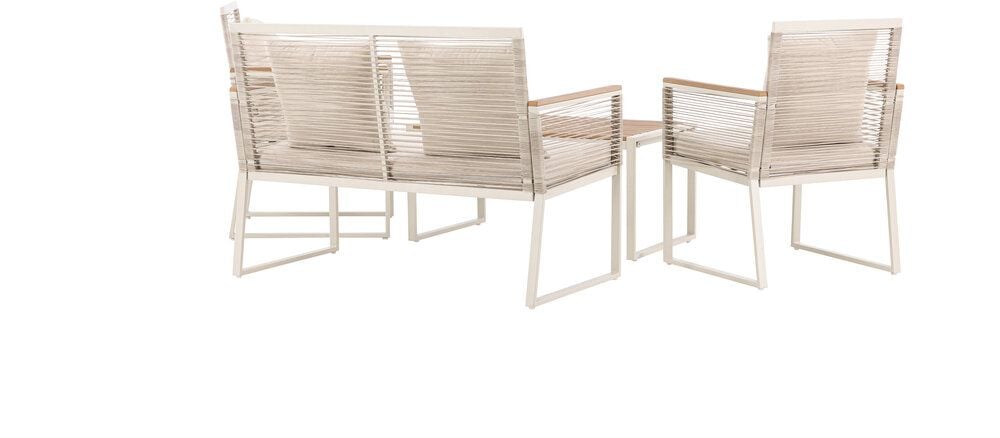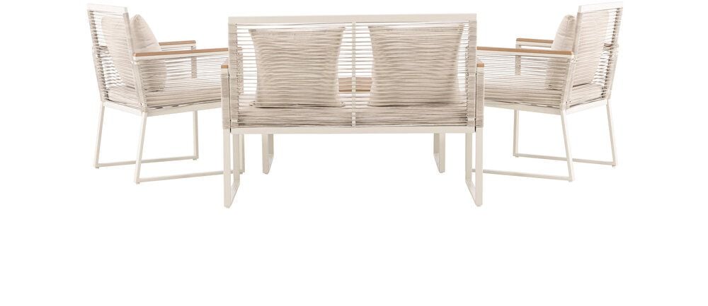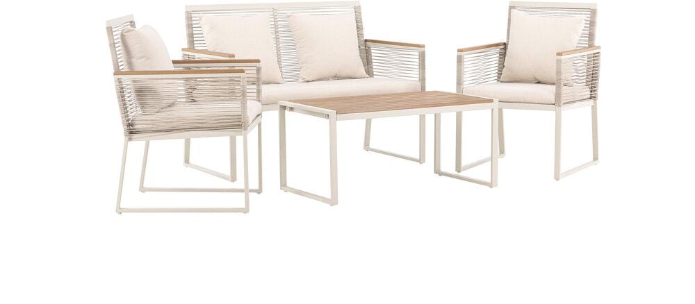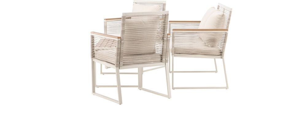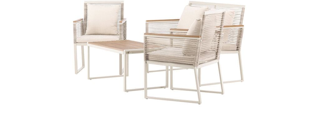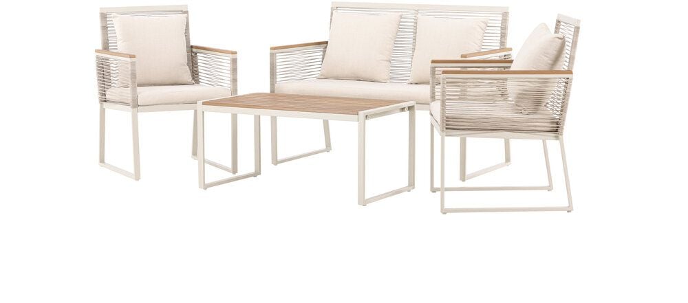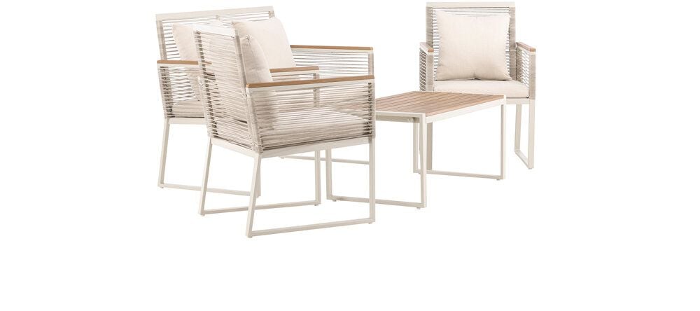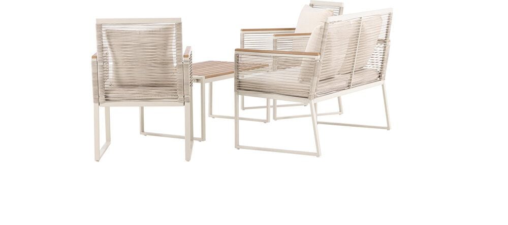 Upplev elegans och komfort med Dallas soffgrupp, den perfekta kompletteringen till din trädgård. Dallas soffgrupp erbjuder en tidlös design med en modern touch, och den är tillverkad med omsorg och utvalda material för att ge dig en bekväm och avslappnad utomhusupplevelse.Soffgruppen inkluderar en rymlig 2-sits soffa, två bekväma stolar och ett praktiskt bord. Du får även sju mjuka dynor som ger extra komfort och en touch av lyx till din sittplats. Med Dallas soffgrupp kan du bjuda in dina nära och kära för avkopplande stunder och underhållande utomhus.Dallas soffgrupp har en ren vit färg och är tillverkad av stål, vilket garanterar hållbarhet och motståndskraft mot väder och vind. Bordet är försedd med en vacker bordsskiva i trä, vilket ger en naturlig känsla.Skapa en avslappnad och inbjudande atmosfär på din terrass, altan eller trädgård med Dallas soffgrupp. Oavsett om du njuter av morgonkaffet i soluppgången eller bjuder in till kvällsfester, kommer Dallas att vara din pålitliga och stilfulla följeslagare. Bordets mått: 90x50x42,5 cm. Soffans mått: 60x84 cm. Sittmått: 49/105x51x37 cm.