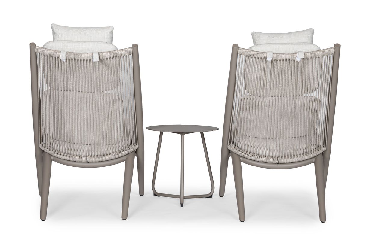 Stommen i aluminium gör möblerna lätta att flytta samtidigt som de är robusta och motståndskraftiga mot väder och vind. Det medföljande mellanbordet – perfekt för drycker, böcker eller små detaljer som förhöjer stunden.
