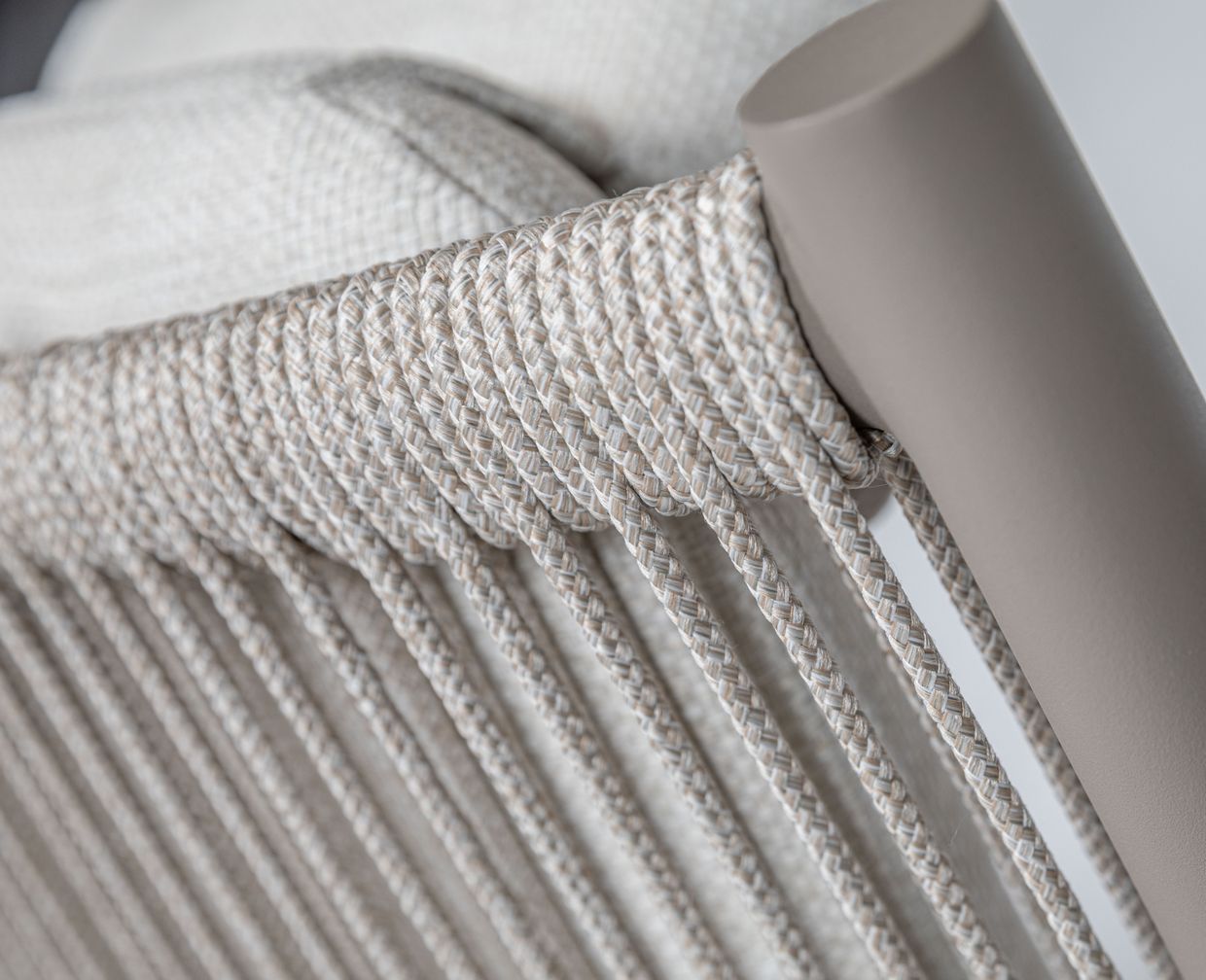 Fåtöljerna är designade med fokus på komfort och avslappning, med generösa dynor klädda i slitstarkt olefintyg. Materialet är både UV-beständigt, vattenavvisande och snabbtorkande – idealiskt för utomhusbruk. De eleganta, vertikala repdetaljerna i olefin ger en luftig och modern känsla samtidigt som de bidrar till stabilitet och hållbarhet.