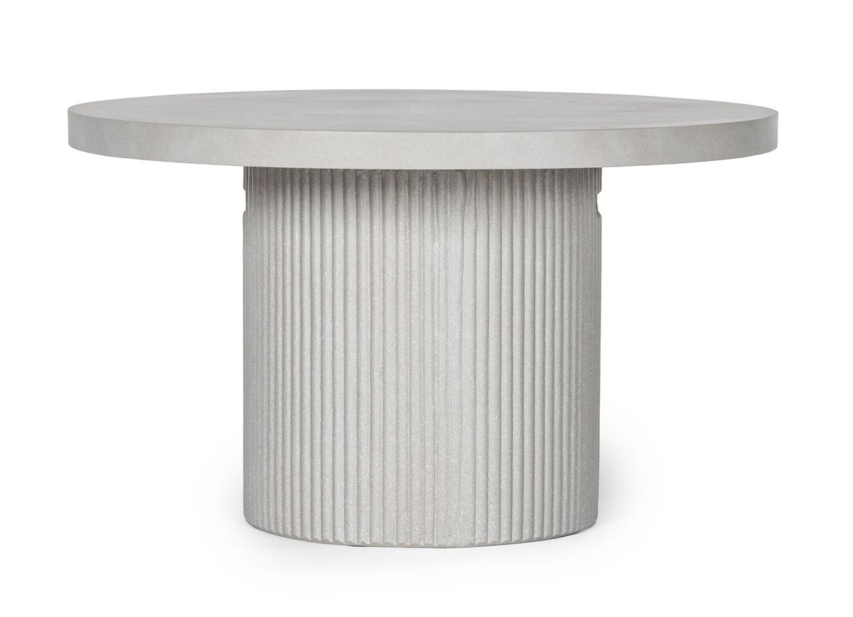 Detta soffbord i fiberbetong kombinerar en robust känsla med en elegant och modern design. Den runda formen tillsammans med den dekorativt räfflade basen skapar ett uttryck som både är tidlöst och trendigt.