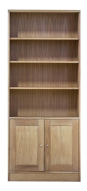 Ekliden byggbar sektionsbokhylla i fanerad oljad ek. E9 är en bred halvöppen hylla med två dörrar. Tre trähyllplan i oljad ek i den öppna delen och ett bak dörrar.
