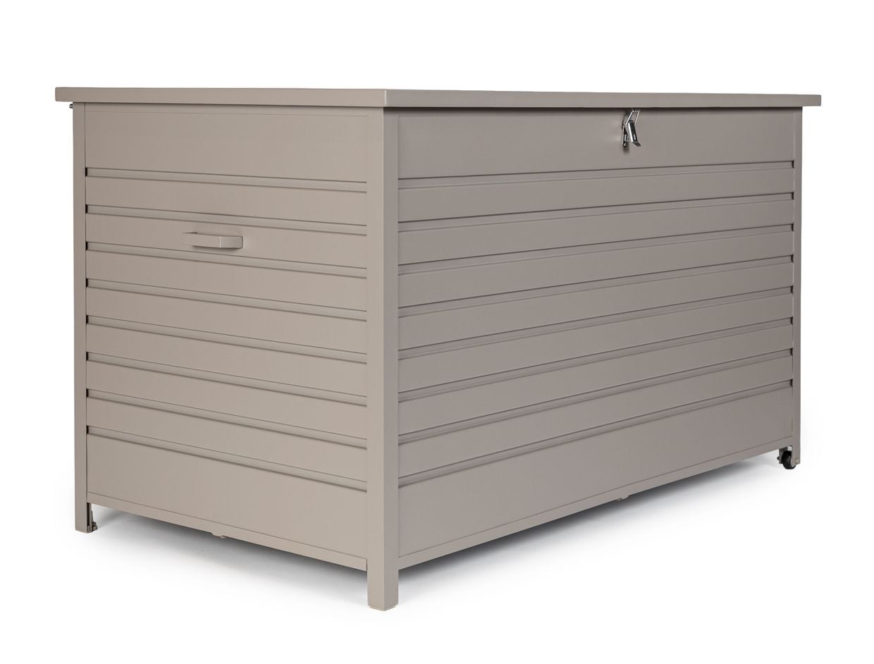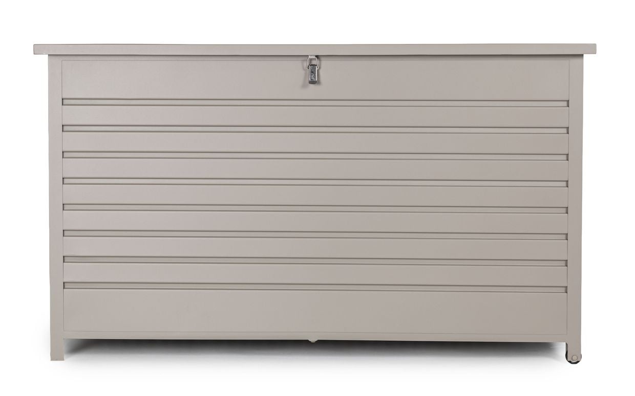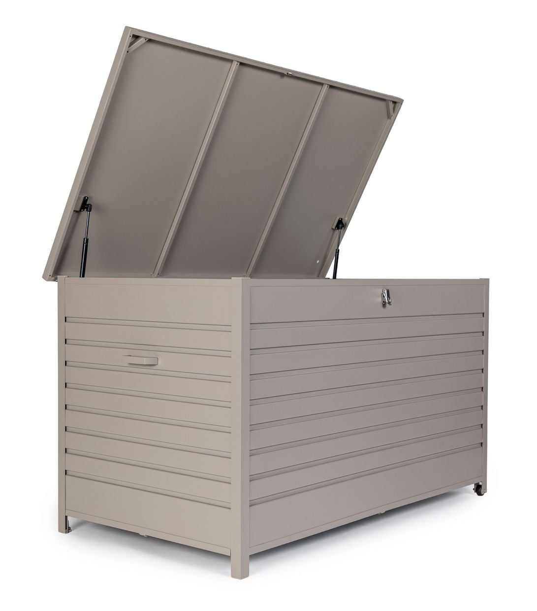Dynlådan är tillverkad helt i aluminium, inklusive handtaget, vilket gör den både slitstark och lätt att hantera. Konstruktionen är anpassad för utomhusbruk och erbjuder en hållbar lösning för förvaring av dynor och andra tillbehör.