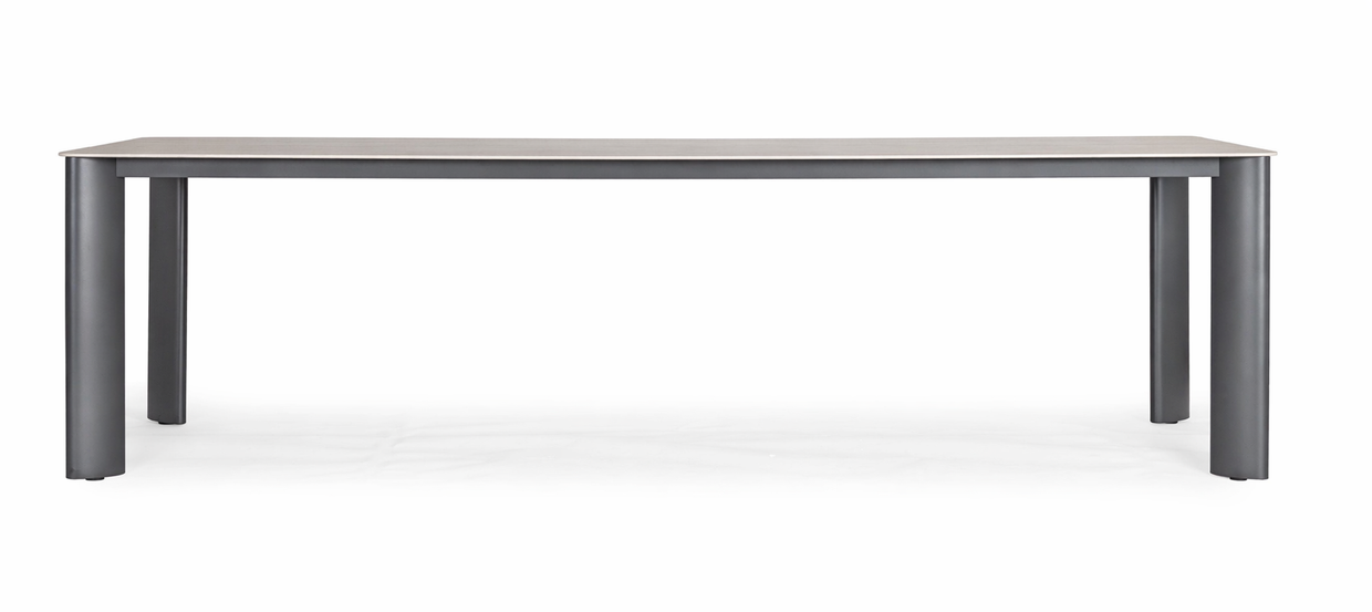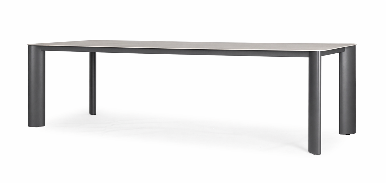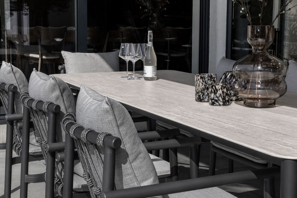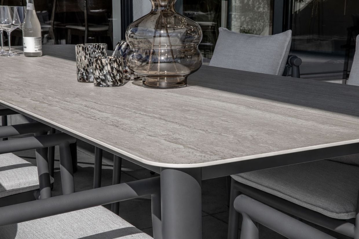 Matbordet i Falsterbo-serien imponerar med sina generösa mått på 280 cm i längd och 100 cm i bredd, vilket ger gott om plats för stora sällskap. Bordsskivan är tillverkad i sintrad sten vilket skapar en vacker yta som kombinerar naturinspirerad estetik med innovativ teknik. Den unika ytan är inte bara elegant utan också slitstark och lättskött, perfekt för utomhusbruk.