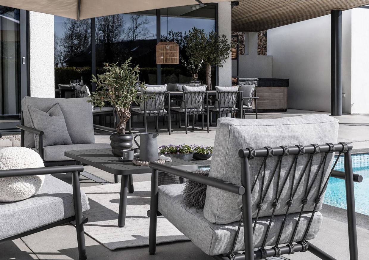 Den stilrena ramen i pulverlackerad aluminium ger en stabil och hållbar grund, medan de flätade snörningsdetaljerna skapar ett luftigt och exklusivt uttryck. Den klassiska färgkombinationen i grått och svart gör att soffgruppen smälter in i olika miljöer och ger uteplatsen en harmonisk känsla.