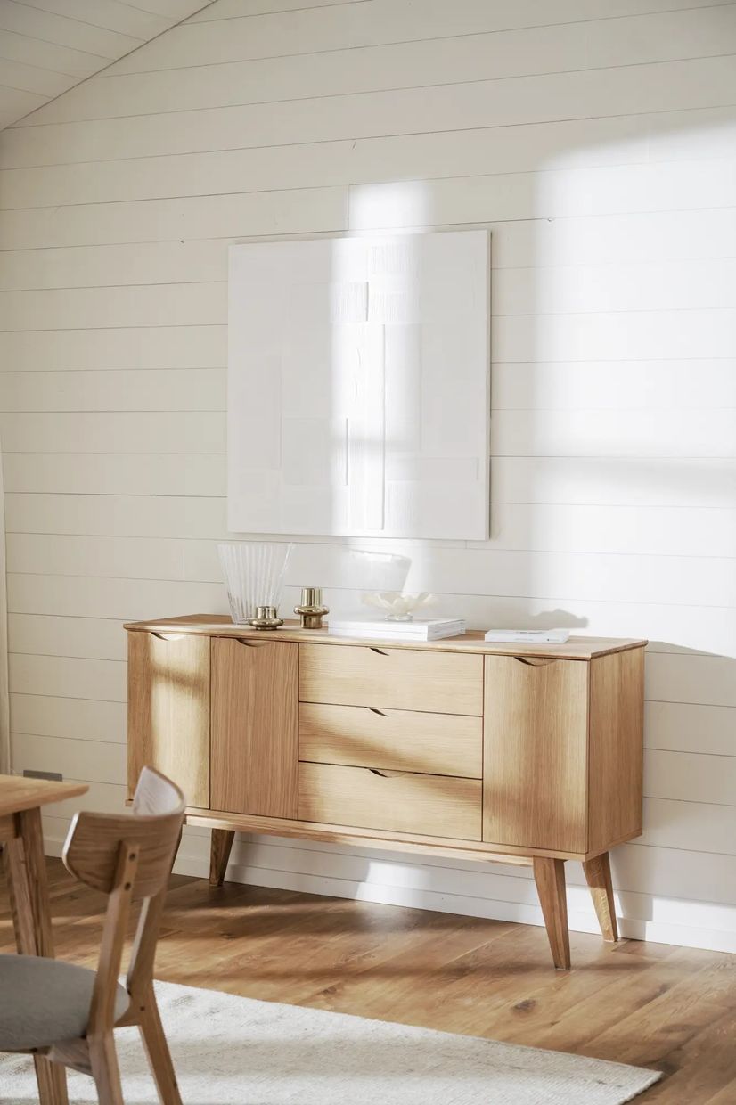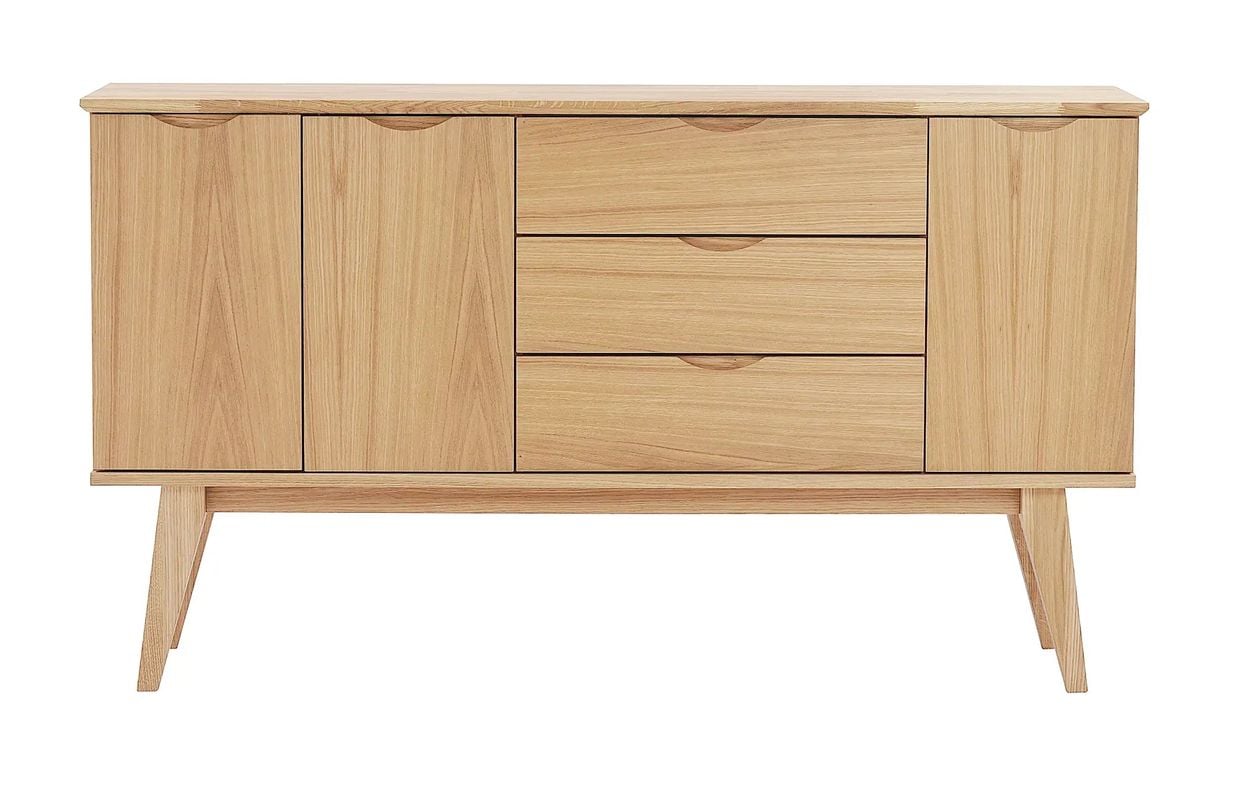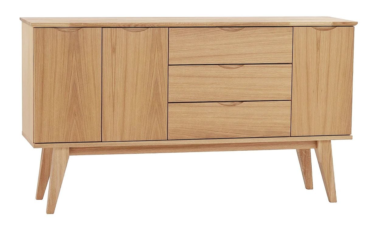 Filippa sideboard 150 cm med generös förvaring. Skåpet är tillverkat i oljad ek och har rymliga mjukstängande lådor och skåp. Benen är lätt utställda vilket ger ett modernt uttryck. Sideboardet är monterat (förutom benen) vid leverans. Sideboardet ingår i vår breda Filippa-serie som även har flera matchande matbord i olika storlekar. Tänk på att! Oljebehandlade ytor ska behandlas med möbelolja innan den används och sedan regelbundet 2- 3 gånger per år för att bibehålla motståndskraft mot fläckar och repor.