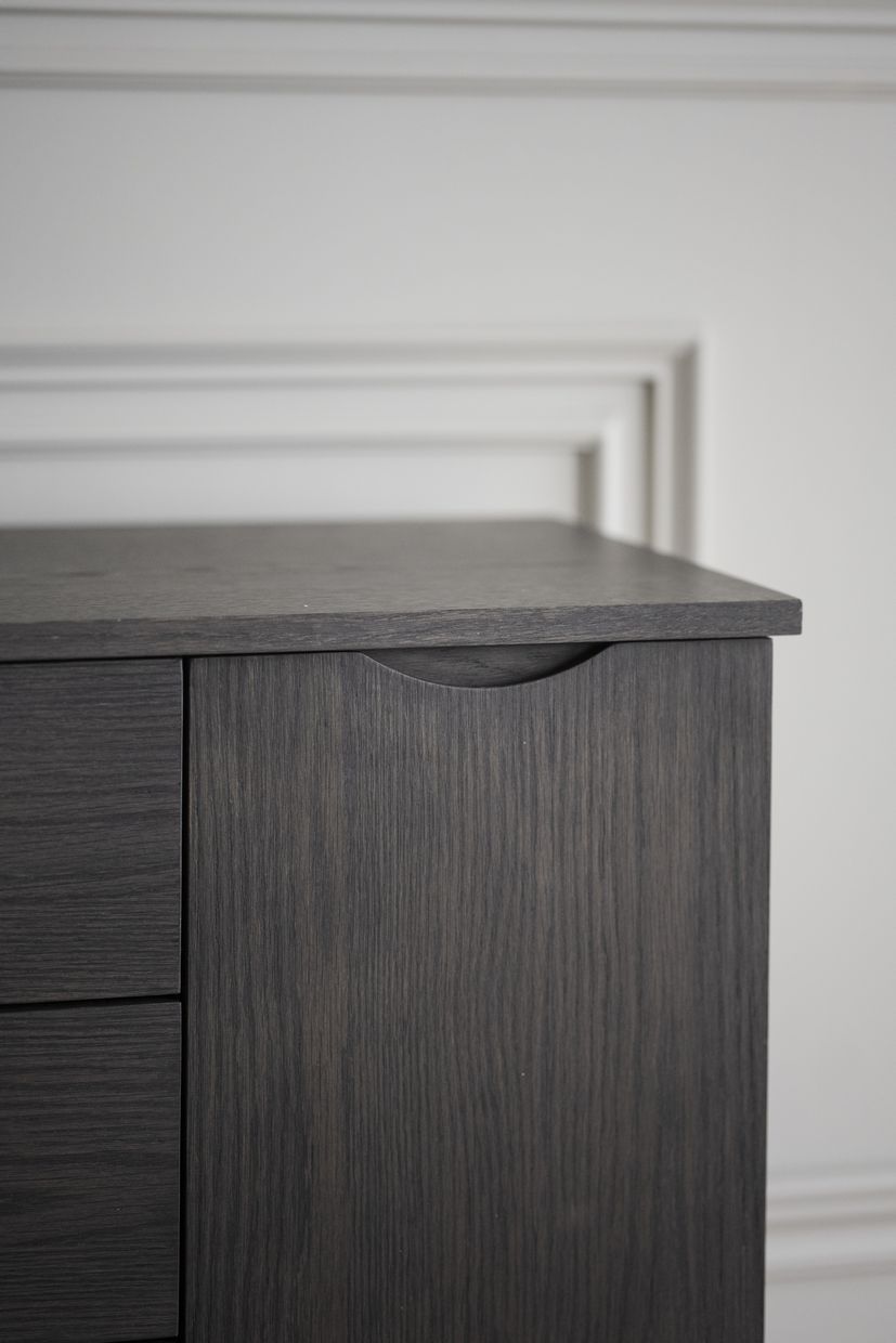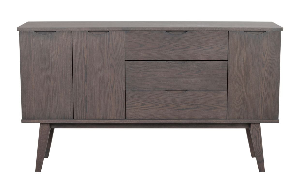 Filippa sideboard 150 cm med generös förvaring. Skänken består av mörkbrun lackad ekfaner samt massiv ek. Dörrar och lådor har mjukstängande soft-close funktion och inuti skåpen finns flyttbara hyllplan. Sideboardet ingår i vår breda Filippa-serie som även har flera matchande matbord i olika storlekar.