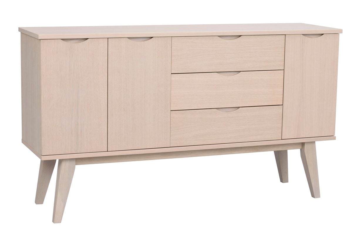 Filippa sideboard 150 cm med generös förvaring. Skänken består av vitpigmenterad ekfaner samt massiv ek. Mjukstängande dörrar samt lådor, och inuti skåpen finns flyttbara hyllplan. Sideboardet ingår i vår breda Filippa-serie som även har flera matchande matbord och soffbord i olika storlekar.