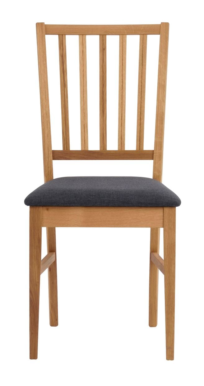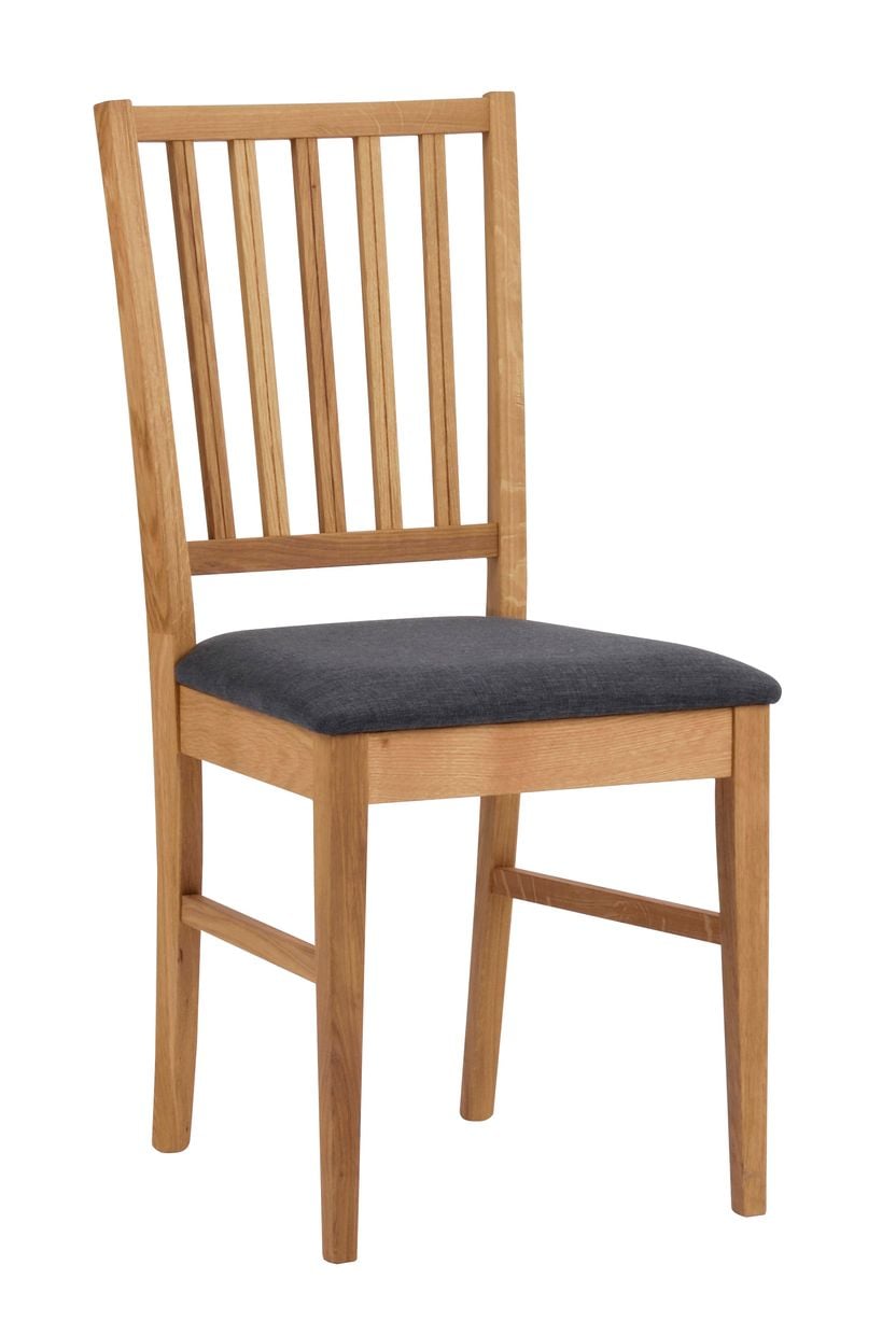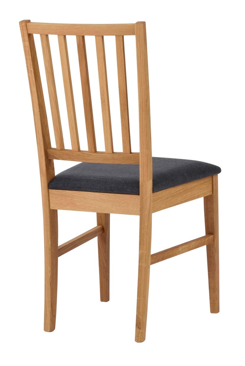 Trästol i tidlös och skandinavisk design. Stolen är i oljad ek med dekorativ stoppad sits med grått tyg. Levereras monterad. Stolen ingår i vår serie Filippa.