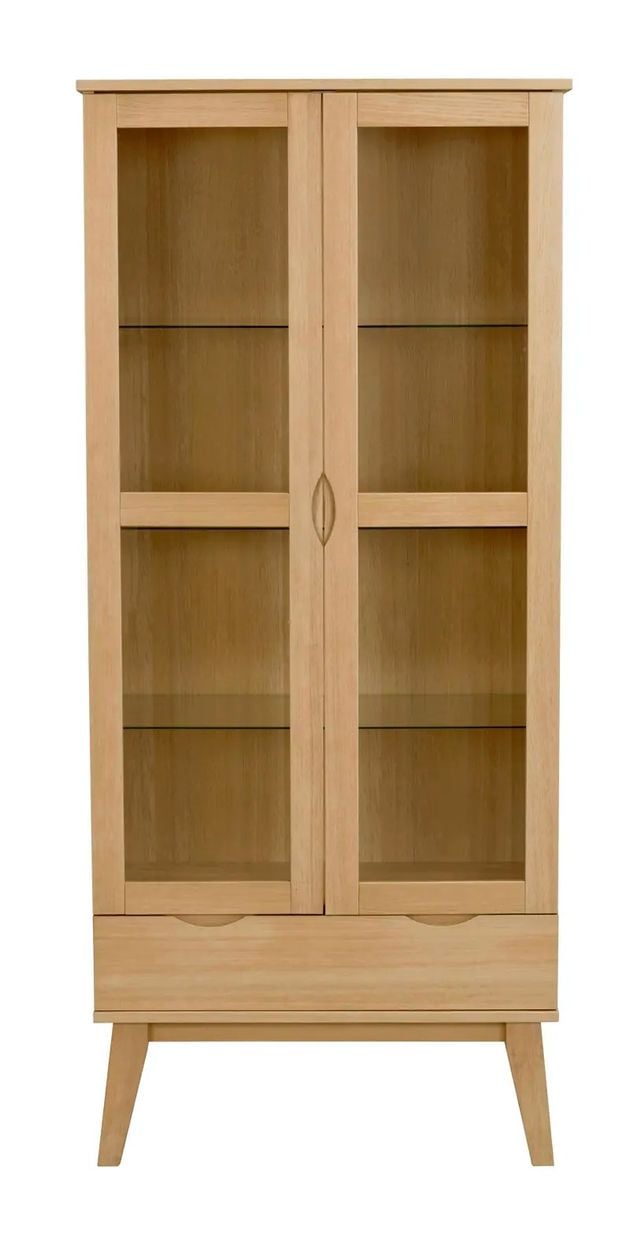 Stilrent och rymligt vitrinskåp i klarlackad ek med glasdörrar samt en låda. Mjukstängande låda och dörrar samt flyttbara hyllplan i härdat glas. Vitrinskåpet ingår i vår breda kollektion Filippa som även har flera matchande matbord och soffbord i olika storlekar.