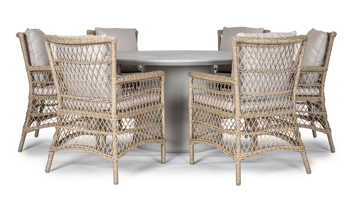 Tylösand karmstolar är tillverkade i slitstark och vädertålig konstrotting, vilket ger ett naturligt uttryck samtidigt som de är enkla att underhålla. Den luftiga designen tillsammans med de mjuka dynorna ger en hög sittkomfort och gör stolarna perfekta för långa och avslappnade middagar.