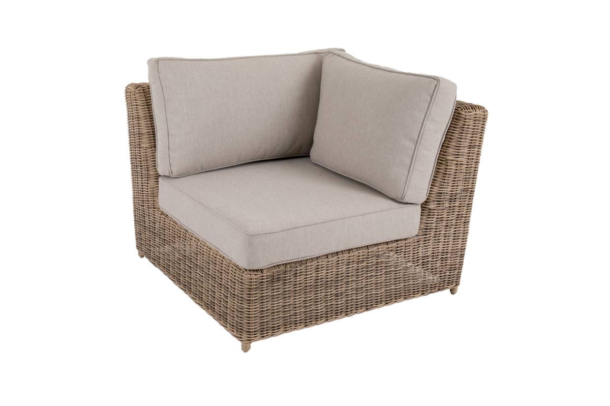 Klassiska möbler i rund konstrotting med rustikt utseende. Generöst sittutrymme och alldeles lagom lutning gör att du vill koppla av länge. Tack vare de olika delarna kan du komponera just den grupp som passar din uteplats, med Glendon kan du verkligen förlänga hemmet utåt.