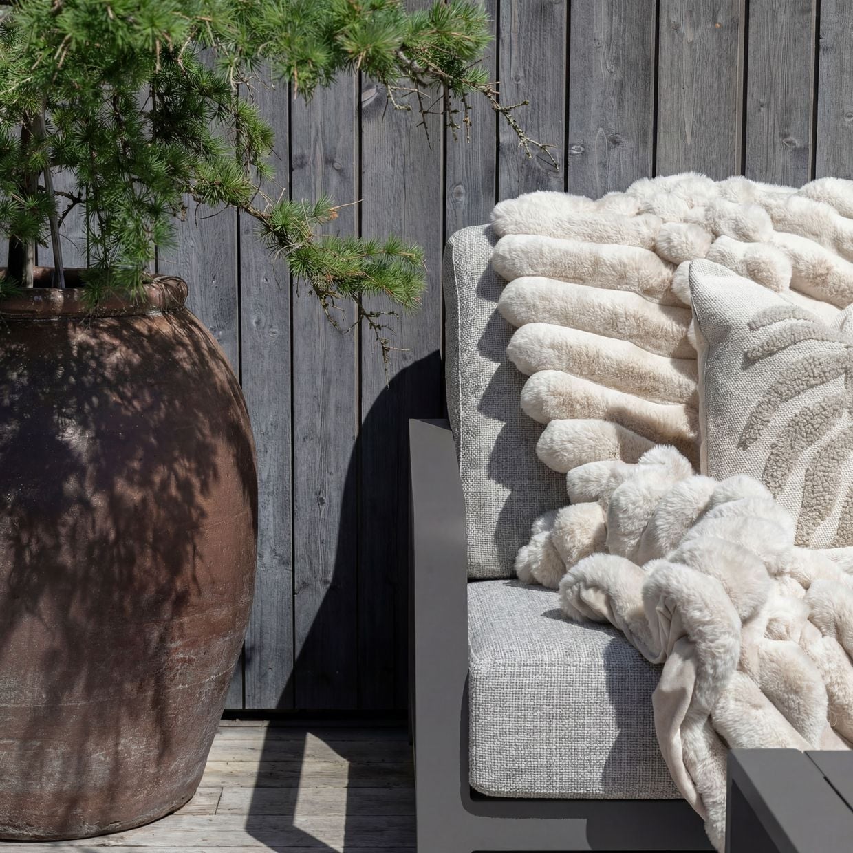 Det rundade hörnbordet fungerar både som ett elegant avlastningsbord och som en hörndel i sofflösningen. Det bidrar till en naturlig och stilren helhet i din utemiljö.