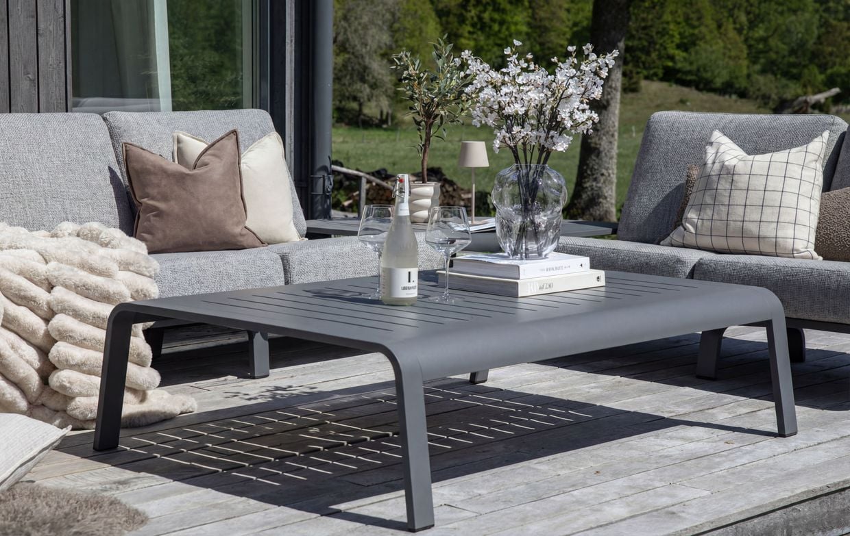 Det rundade hörnbordet fungerar både som ett elegant avlastningsbord och som en hörndel i sofflösningen. Det bidrar till en naturlig och stilren helhet i din utemiljö.