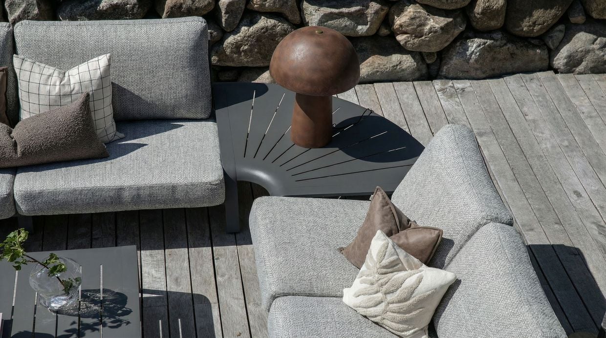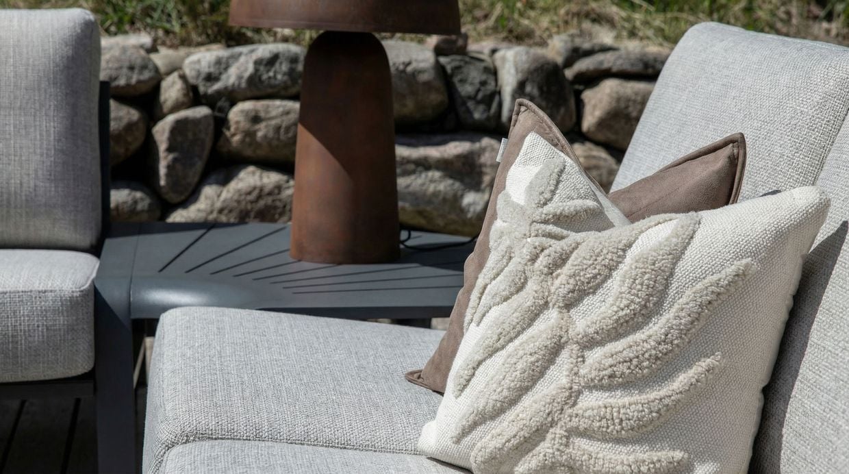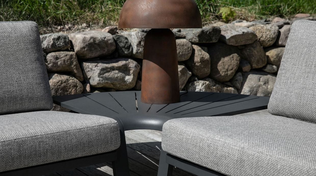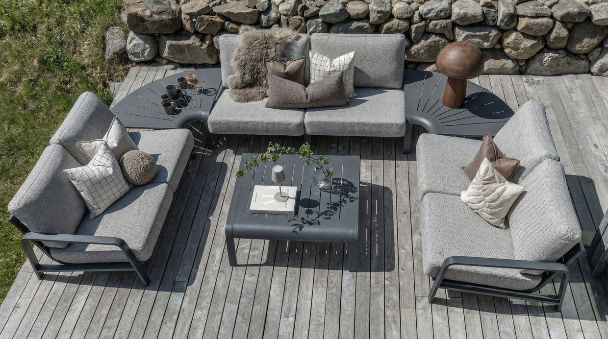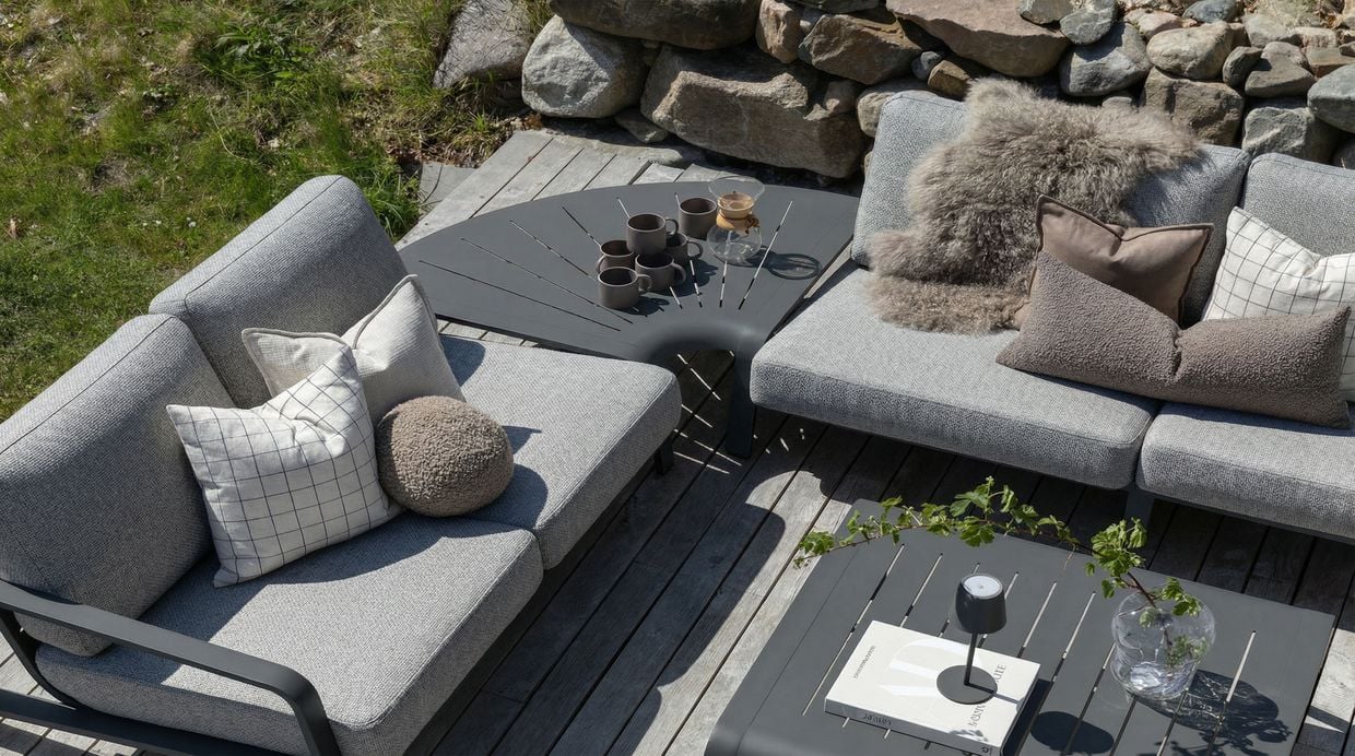 Det rundade hörnbordet fungerar både som ett elegant avlastningsbord och som en hörndel i sofflösningen. Det bidrar till en naturlig och stilren helhet i din utemiljö.