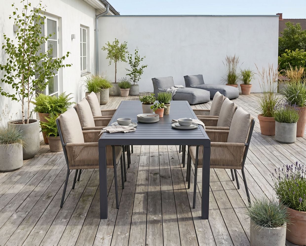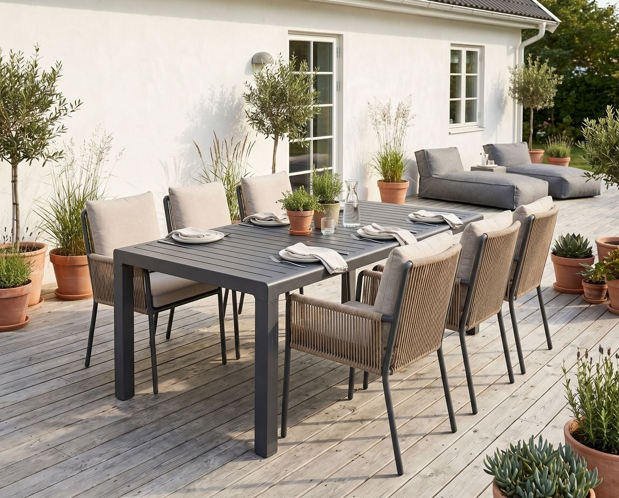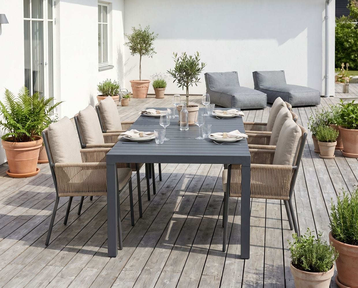 Skapa en stilren och inbjudande matplats utomhus med Le graisse matbord i kombination med Tony karmstolar i antracit. Denna eleganta matgrupp kombinerar modern design med hög komfort och passar perfekt på altanen, uteplatsen eller i trädgården.