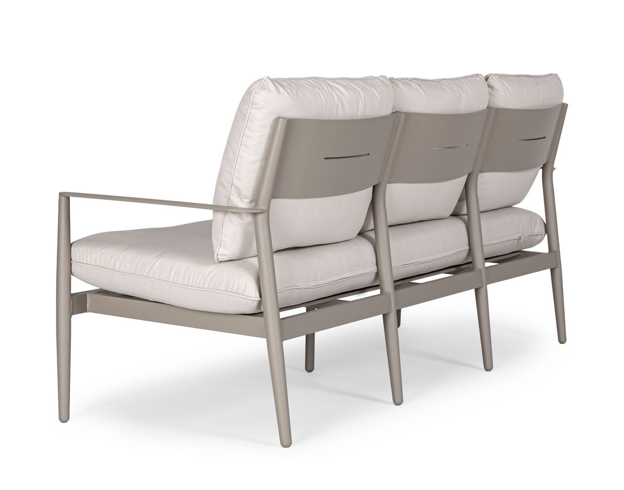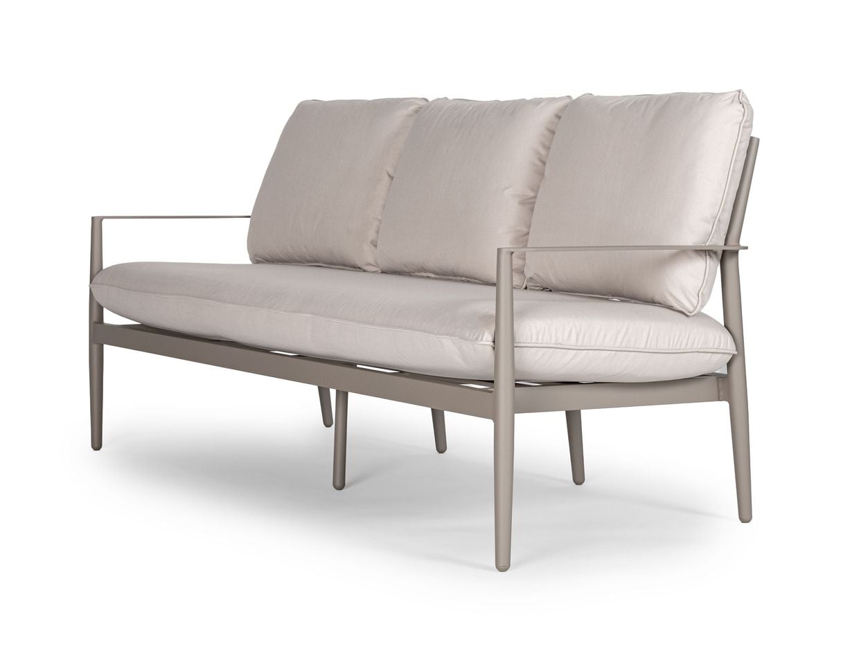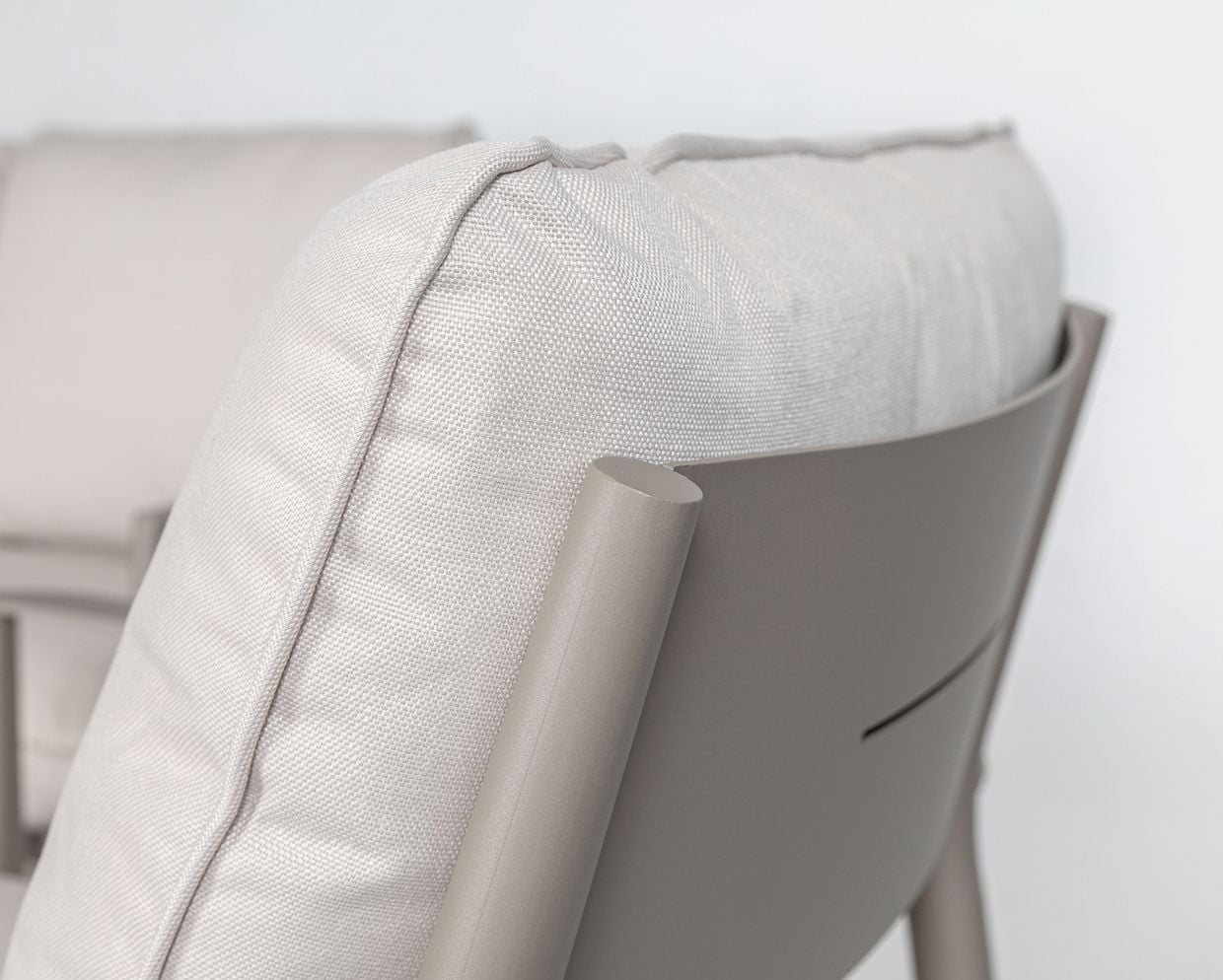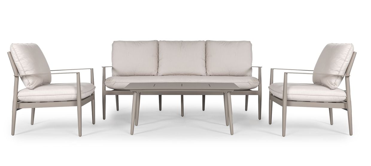 De mjukt välvda ryggstöden ger ett naturligt stöd och en avslappnad sittställning, samtidigt som de generösa dynorna i tåligt olefintyg bidrar till hög komfort. Materialvalen gör soffgruppen både bekväm och praktisk – perfekt för långa, sköna stunder utomhus.