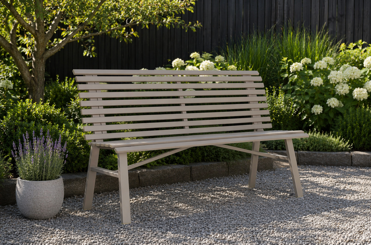 Bänken är lackerad i vår egen kulör Nordisk beige, en harmonisk och naturnära ton som smälter vackert in i grönskande miljöer. Färgen är noggrant framtagen för att matcha våra övriga möbler i samma kulör, vilket gör det enkelt att skapa en enhetlig och stilren utemiljö.