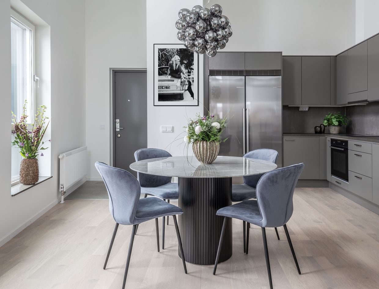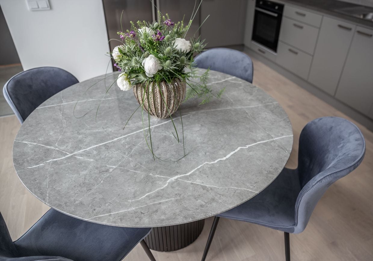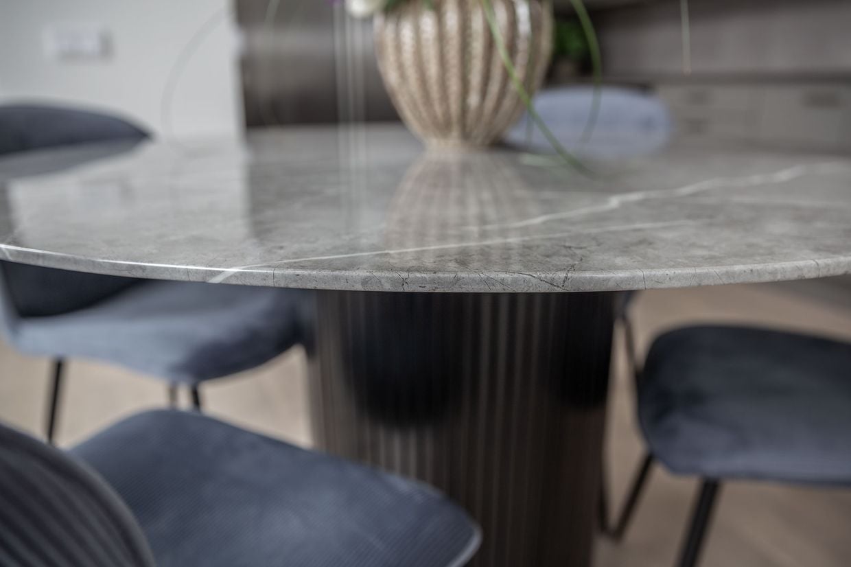 Runt matbord med skiva i sintered stone. Sintered stone är ett idealiskt material för matbord tack vare sin hållbarhet och praktiska egenskaper. Den är reptålig, värmetålig och fläckresistent, vilket gör den perfekt för dagligt bruk. Den icke-porösa ytan är hygienisk och lätt att rengöra, samtidigt som den tål spill av mat och dryck utan att ta skada. Dess eleganta design och möjlighet att imitera naturliga material som marmor eller trä gör att bordsskivan inte bara är funktionell utan också stilren och estetiskt tilltalande. Materialet är dessutom UV-beständigt och håller sin färg över tid. Underredet är i trä/MDF. 4 stolar i grått manchestertyg och svarta metallben