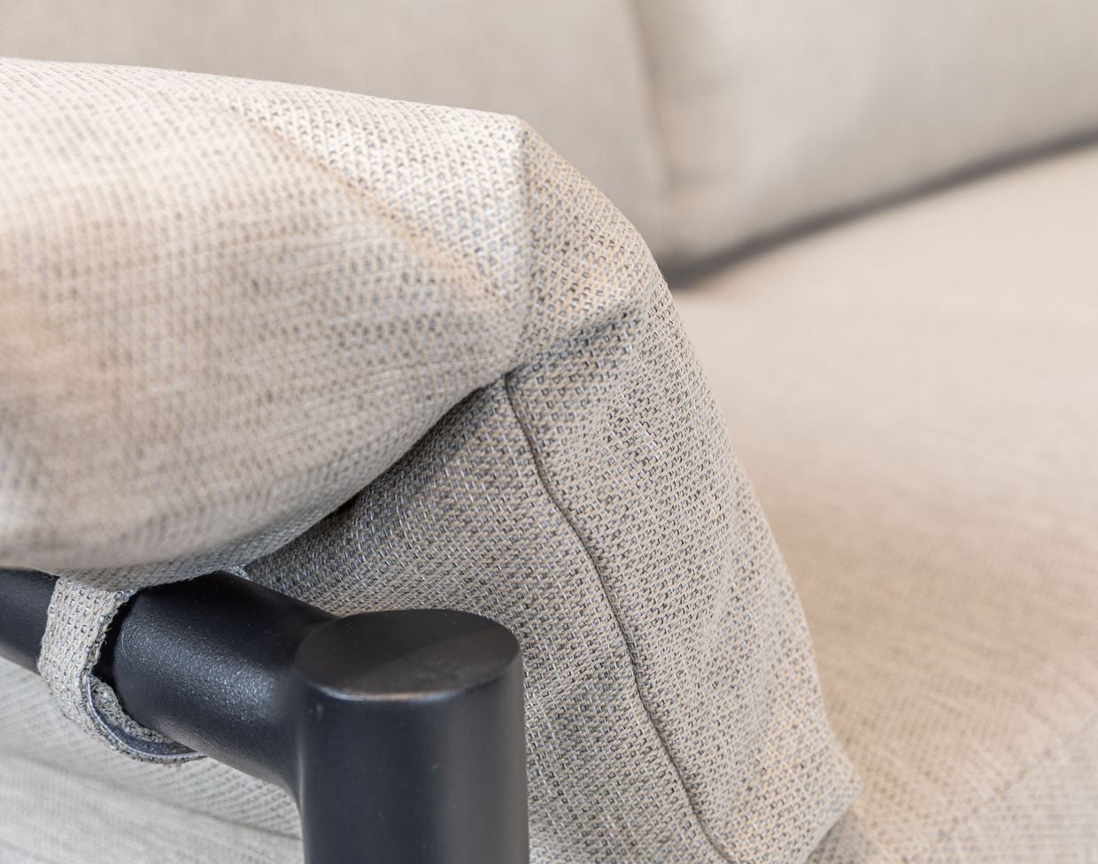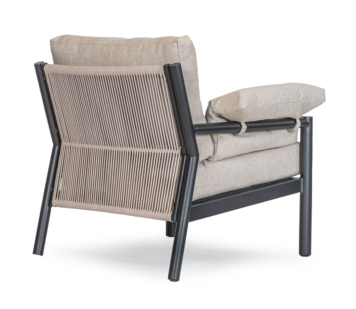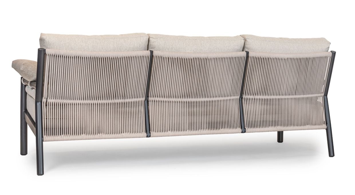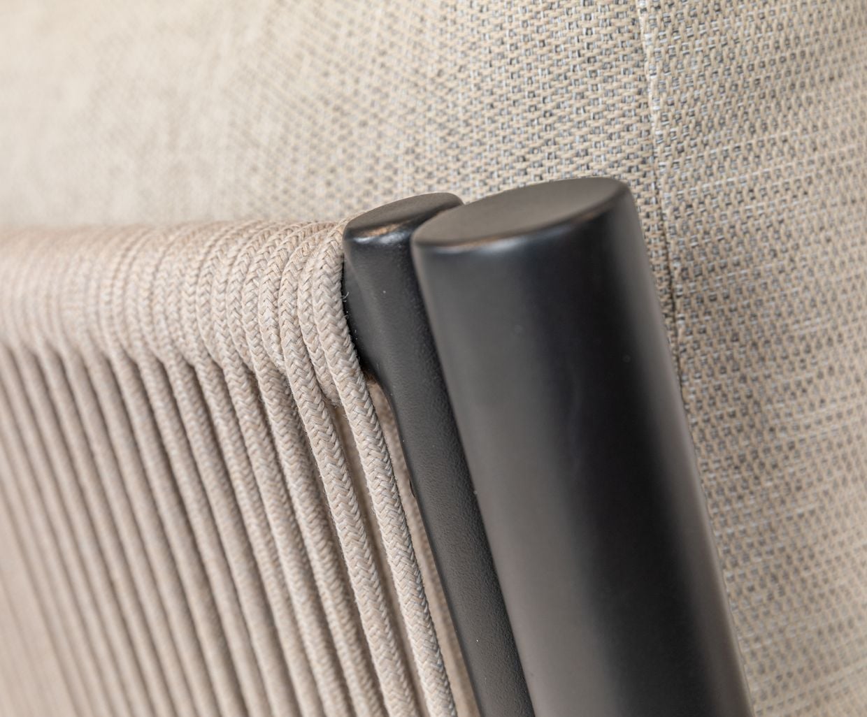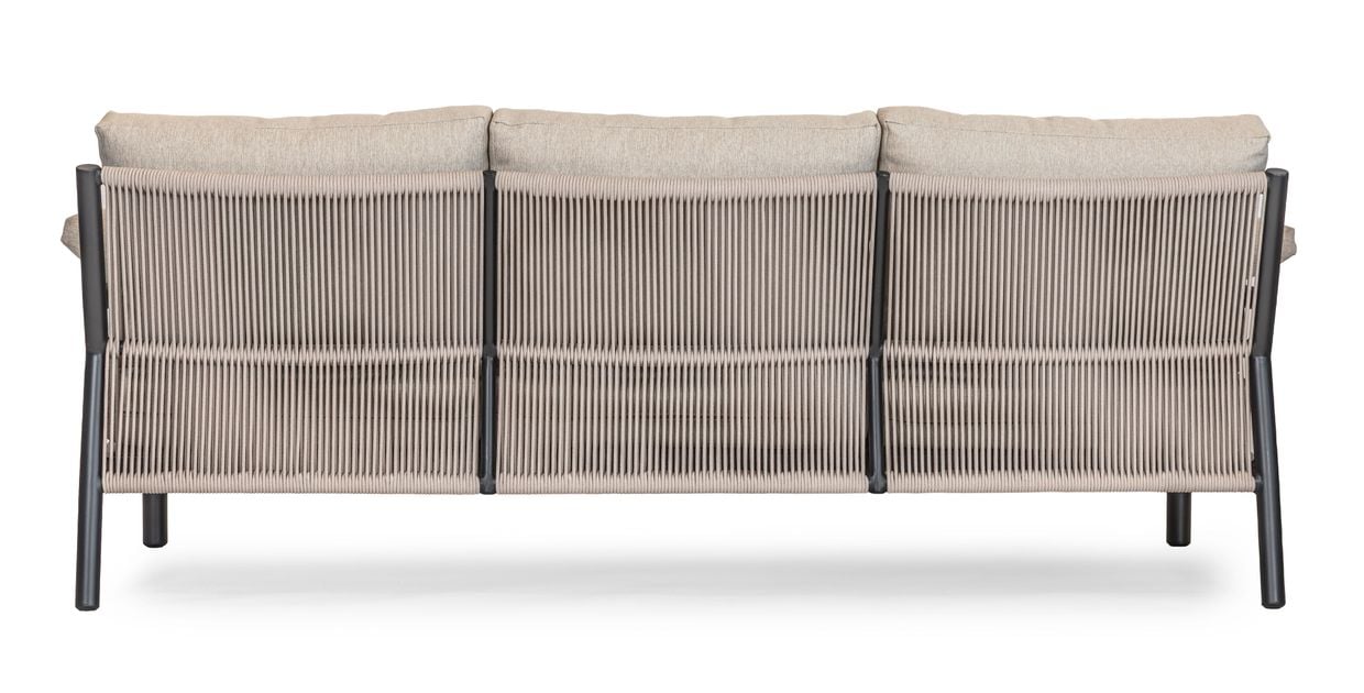 Soffans rygg är försedd med dekorativa repdetaljer i olefin – ett slitstarkt och väderbeständigt material som ger gruppen ett modernt och luftigt uttryck.