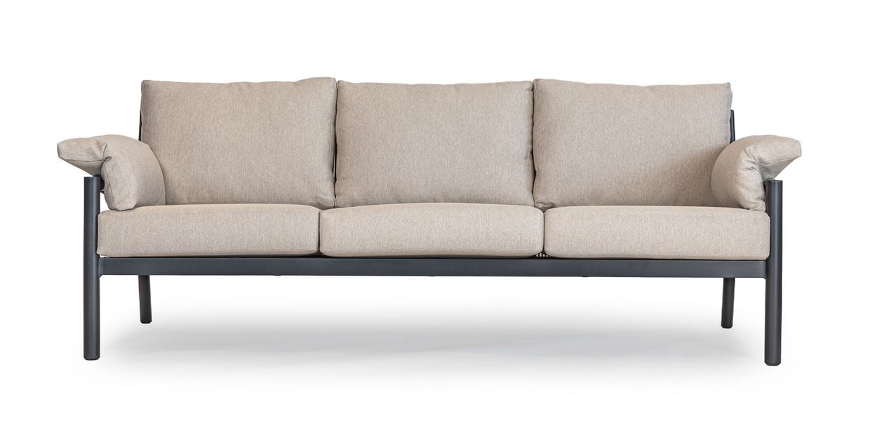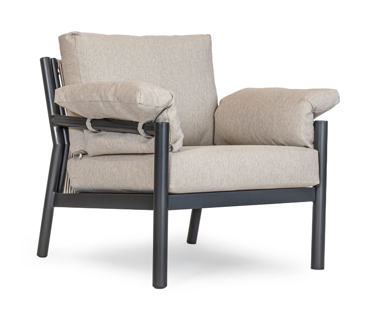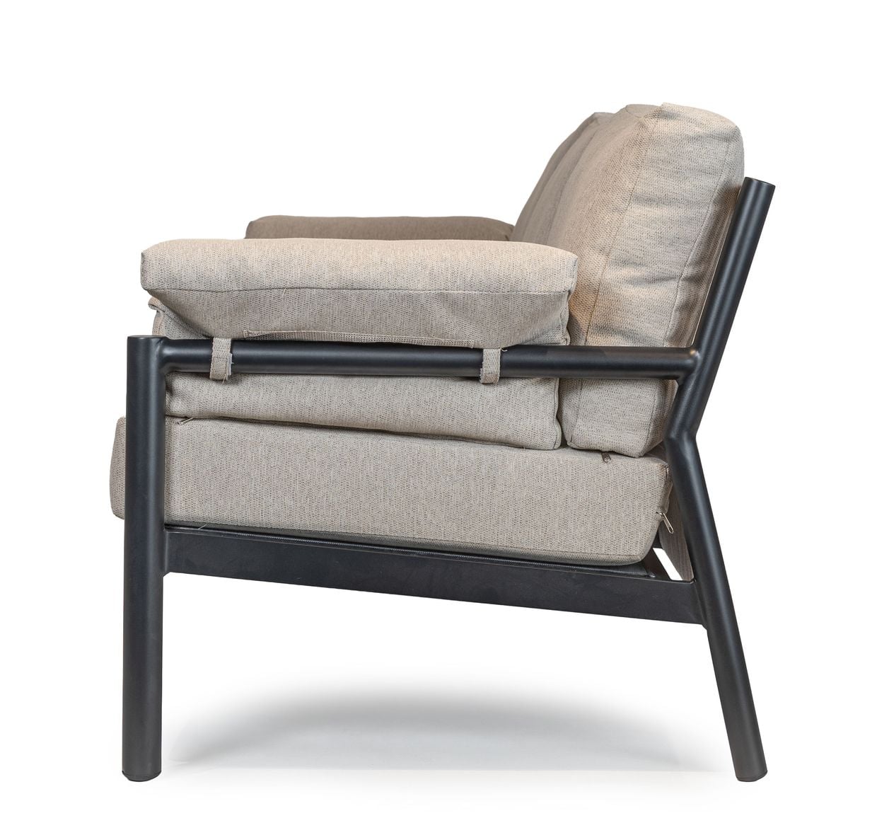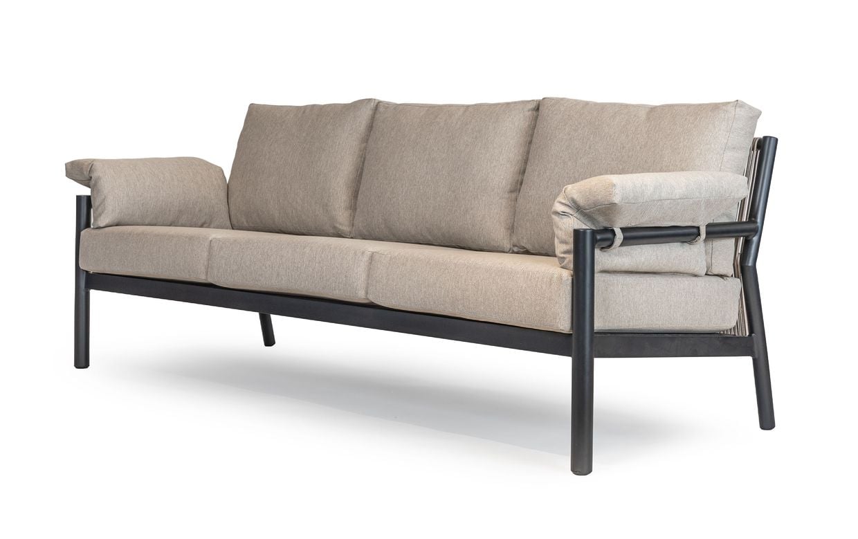 Soffans rygg är försedd med dekorativa repdetaljer i olefin – ett slitstarkt och väderbeständigt material som ger gruppen ett modernt och luftigt uttryck.