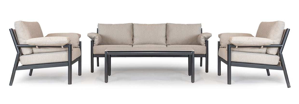 Skapa en inbjudande och harmonisk uteplats med soffgruppen Mathilda – en elegant och genomtänkt loungegrupp som kombinerar modern design med hög funktionalitet. Gruppen består av en rymlig soffa, två bekväma fåtöljer samt ett stilrent soffbord, perfekt för både avkoppling och sociala stunder utomhus.