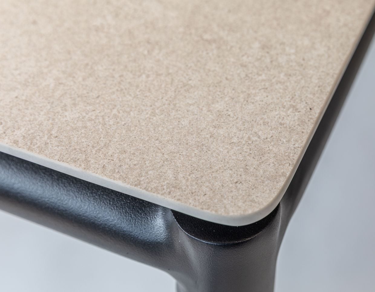 Soffbordet fulländar helheten med sin exklusiva skiva i sintrad sten, ett material som är både elegant och mycket tåligt mot repor, värme och fläckar.