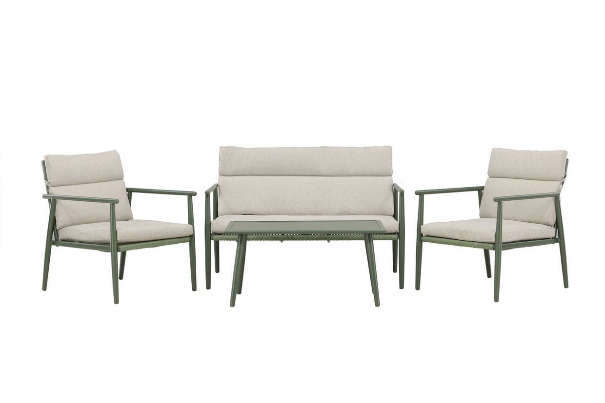 Mazzaro är soffgruppen som förenar stil och komfort för en harmonisk utomhusmiljö. Med en elegant och unik grön stålram blir denna grupp ett iögonfallande inslag på uteplatsen, samtidigt som den erbjuder en lätt och luftig design. Setet består av en soffa, två bekväma fåtöljer och ett litet rektangulärt bord – allt för att skapa den perfekta platsen att njuta av utomhuslivet med vänner och familj. De beige dynorna i polyestertyg ger en mjuk kontrast till den gröna ramen och förstärker det stilrena intrycket. Mazzaro passar lika bra för en avkopplande kaffestund som för festliga tillfällen under sommarkvällarna. Detta nätta set smälter enkelt in i din utemiljö och kombinerar design med funktionalitet. Skapa en inbjudande atmosfär med soffgruppen Mazzaro – där elegans och komfort möts i perfekt balans.
