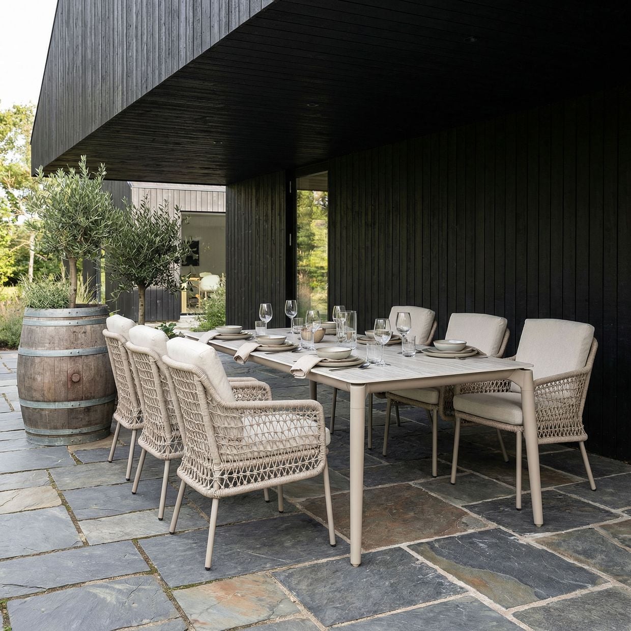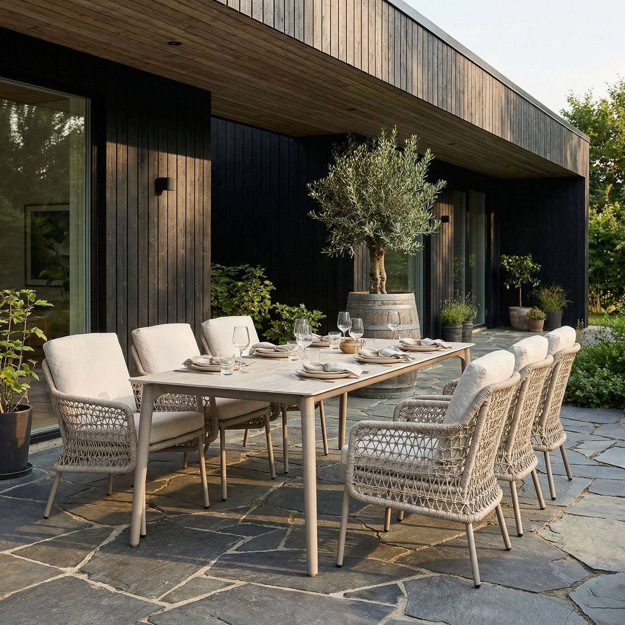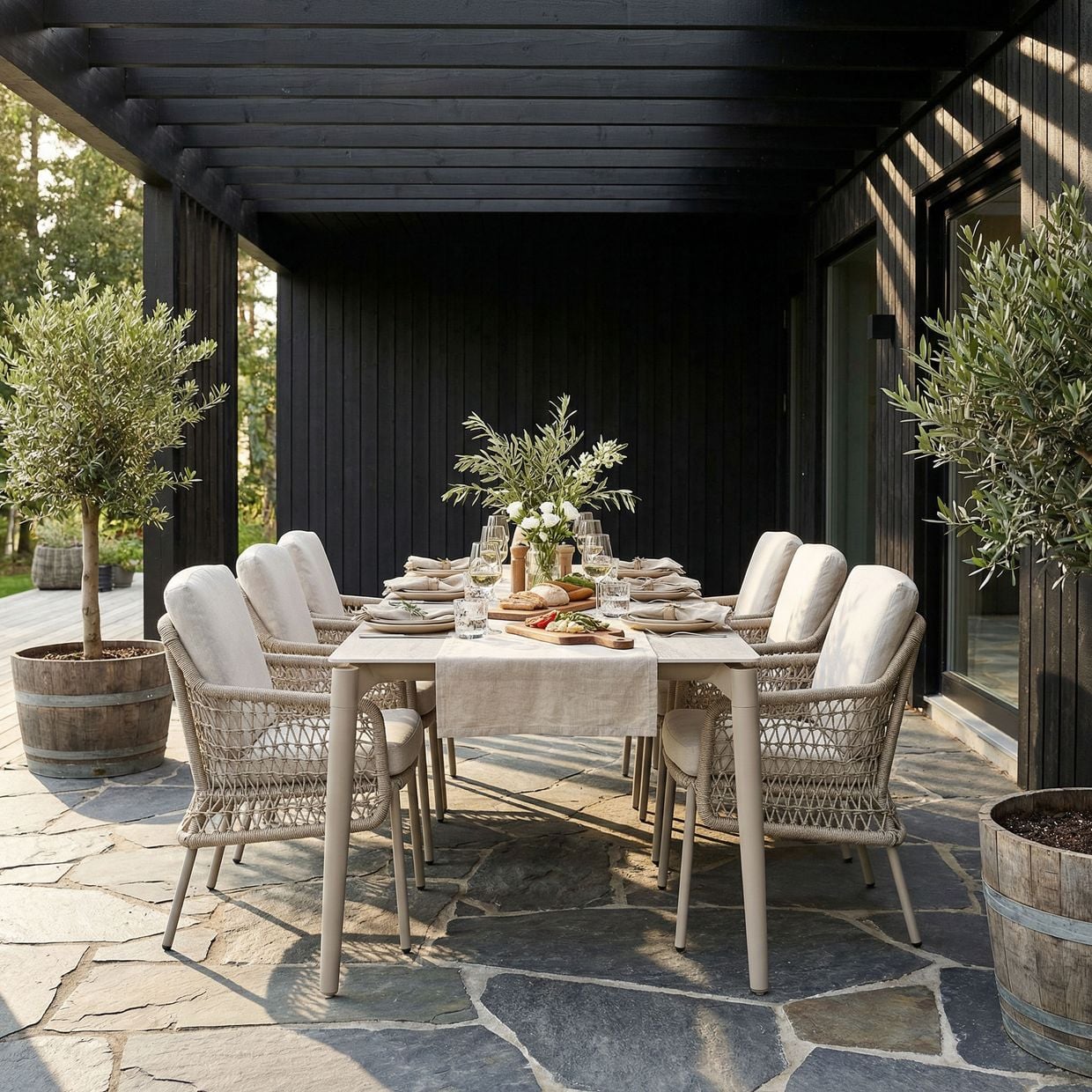 Skapa en elegant och inbjudande matplats utomhus med Mellby matgrupp i kombination med Arild karmstolar. Här möts modern skandinavisk design, hållbara material och hög komfort i en genomtänkt helhet – perfekt för både vardagens måltider och sommarens långa middagar.