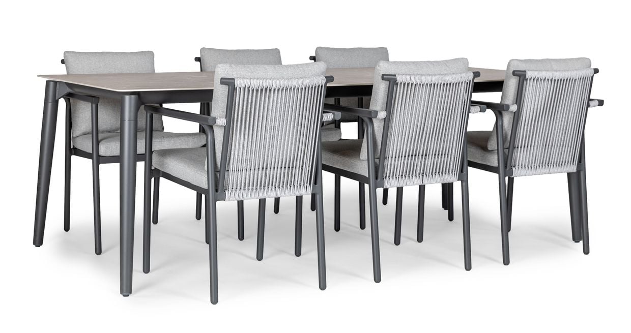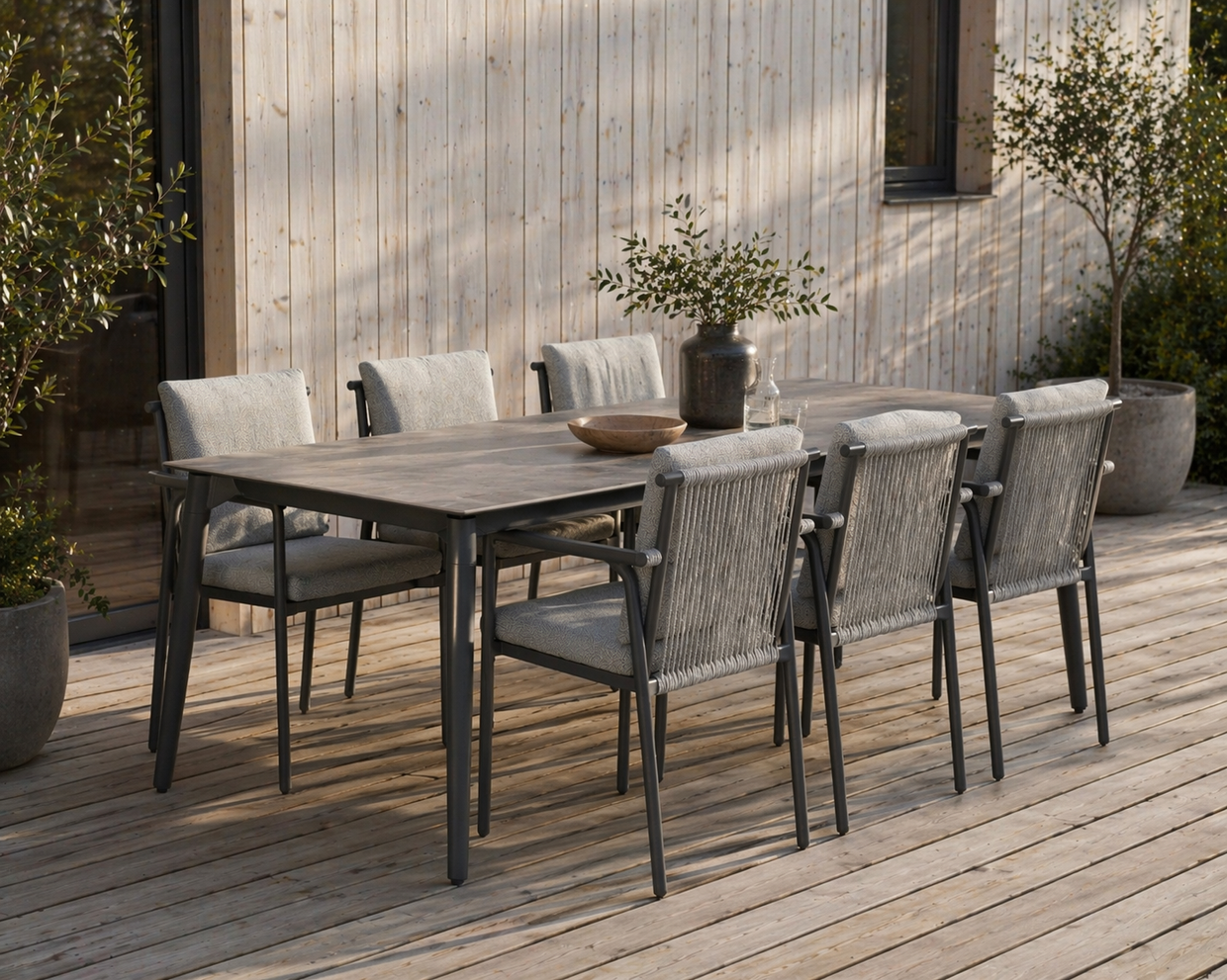 Skapa en harmonisk och inbjudande utemiljö med denna exklusiva matgrupp i färgen Nordisk antracit. Den mjuka, naturliga tonen gör möbeln enkel att kombinera med våra övriga utemöbler och passar perfekt i både moderna och klassiska miljöer.
