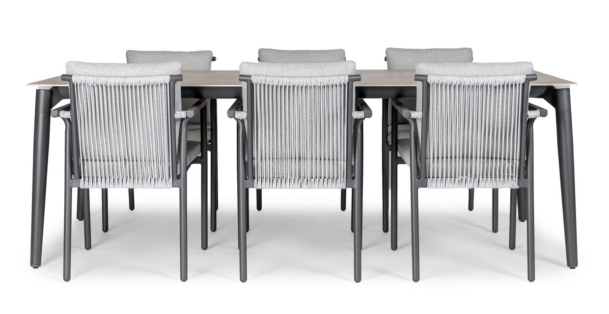 Stolarna är designade med fokus på både komfort och hållbarhet. Den robusta aluminiumstommen kombineras med sits och rygg i olefin, ett vädertåligt och snabbtorkande material som står emot både fukt och blekning. De medföljande dynorna i olefin ger en mjuk och bekväm sittupplevelse – perfekt för långa middagar utomhus.