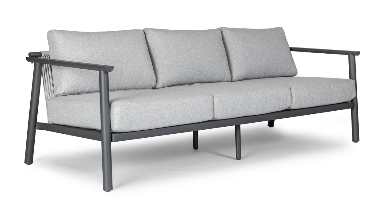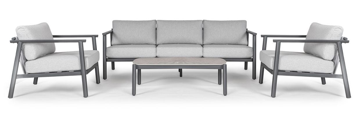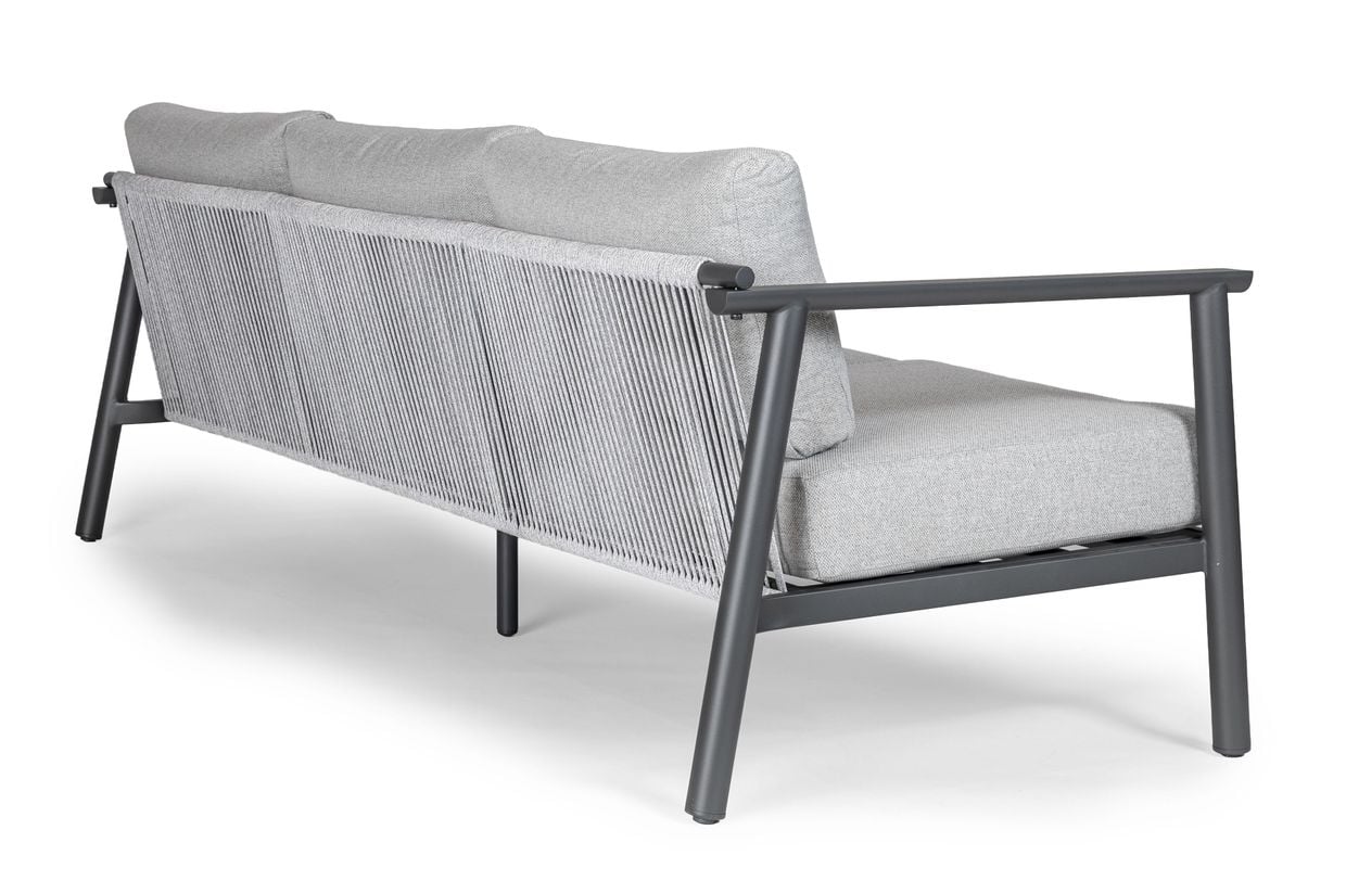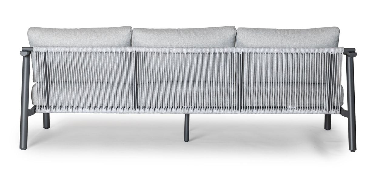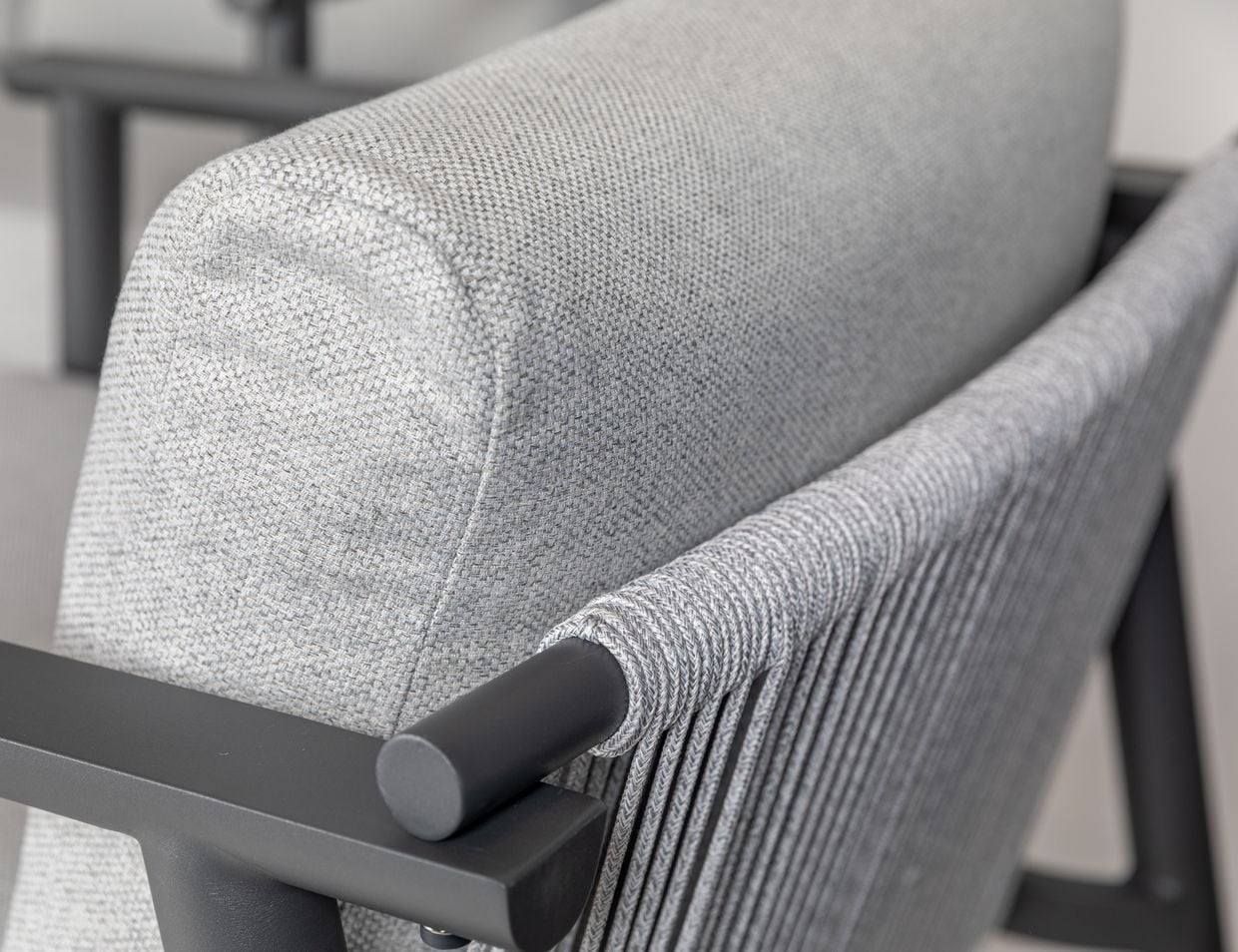 Ryggpartiet är klätt i dekorativt rep som tillsammans med de generösa dynorna ger både ett luftigt uttryck och hög komfort. Repet och dynorna är tillverkade i 100% olefin, ett material som är särskilt anpassat för utomhusbruk tack vare sin slitstyrka, färgbeständighet och smutsavvisande egenskaper.