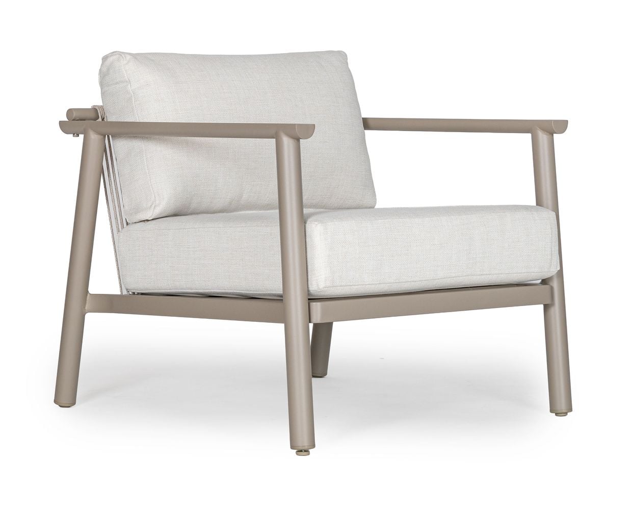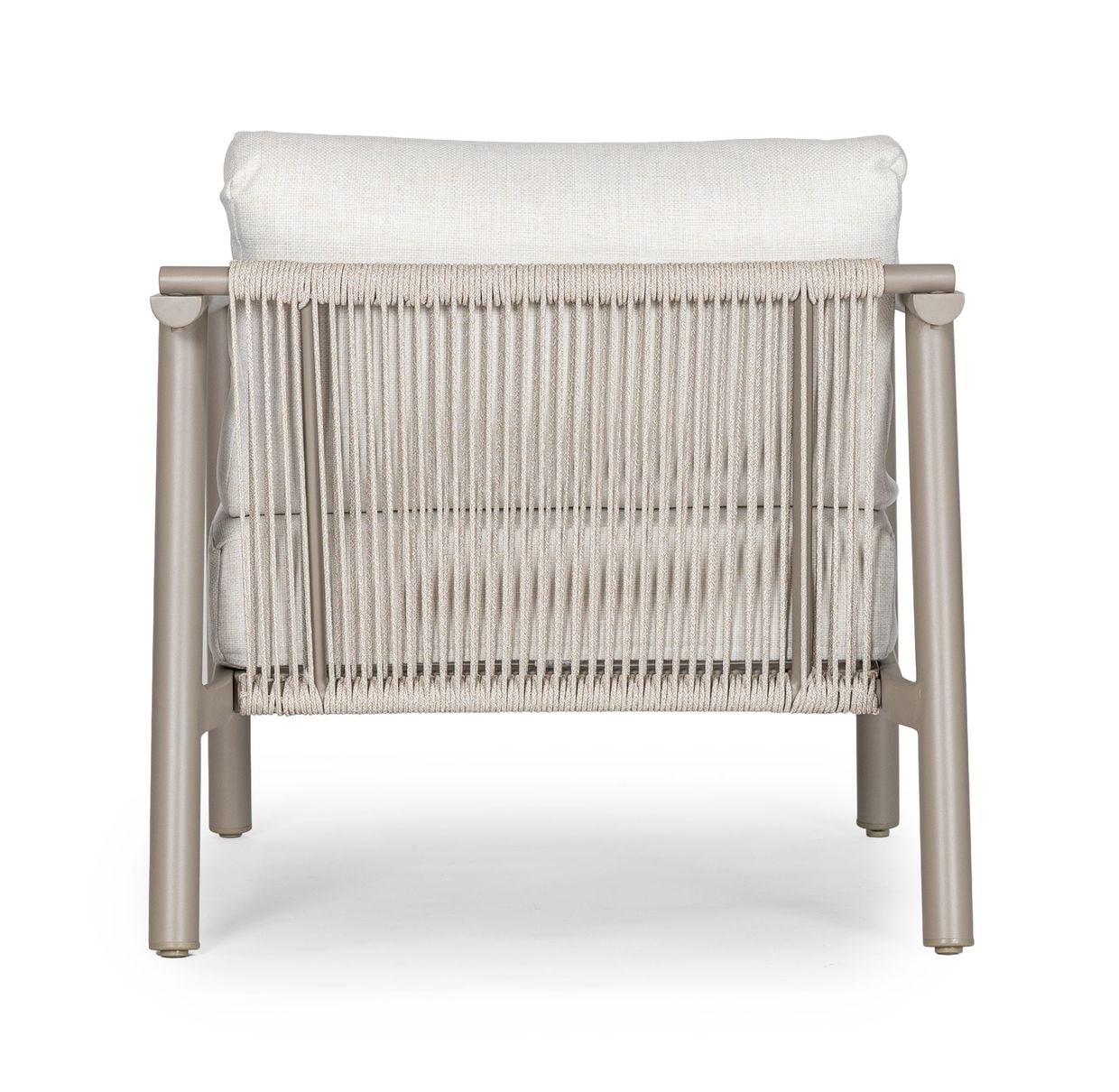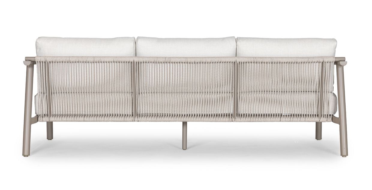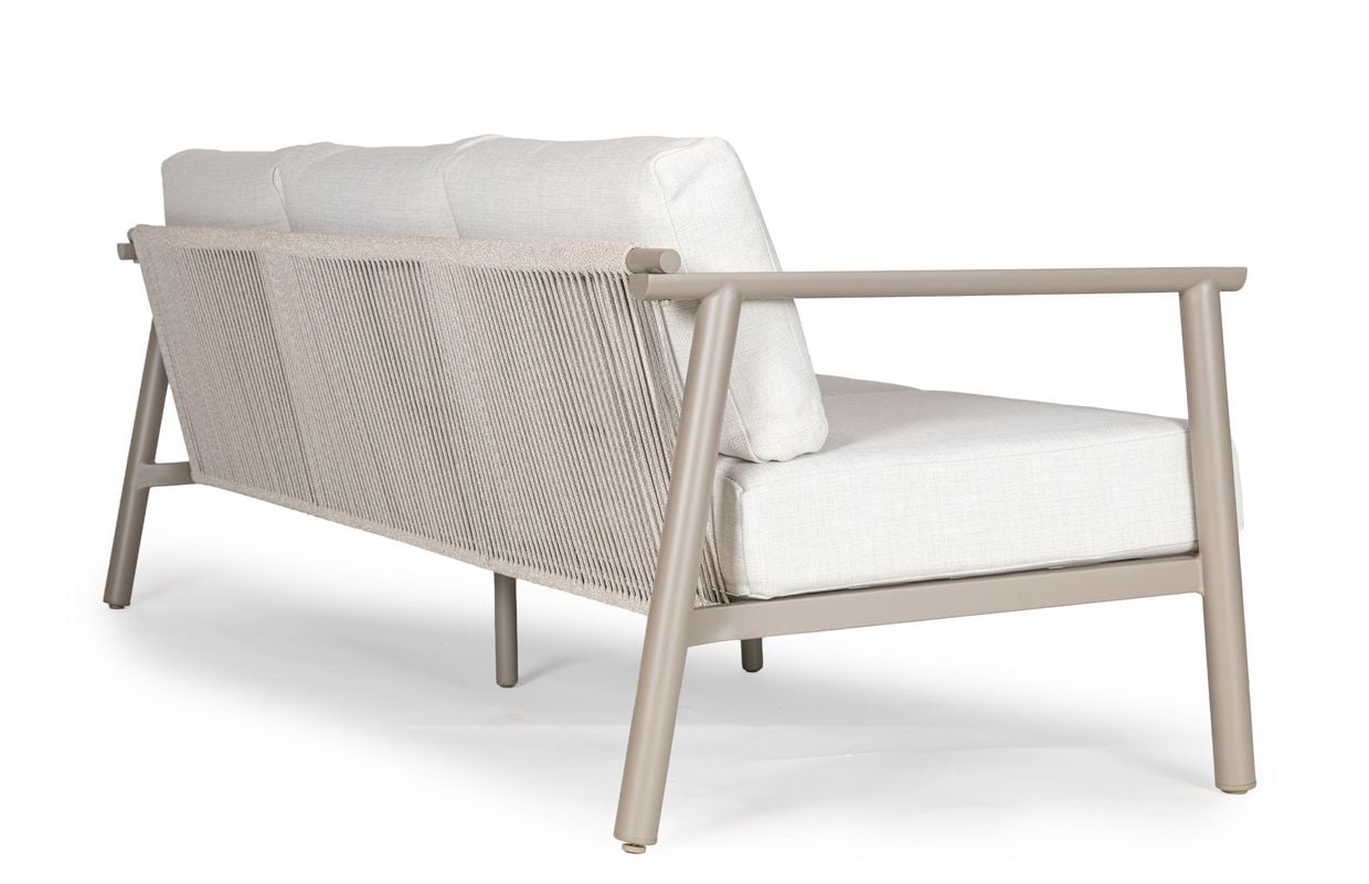 Ryggpartiet är klätt i dekorativt rep som tillsammans med de generösa dynorna ger både ett luftigt uttryck och hög komfort. Repet och dynorna är tillverkade i 100% olefin, ett material som är särskilt anpassat för utomhusbruk tack vare sin slitstyrka, färgbeständighet och smutsavvisande egenskaper.