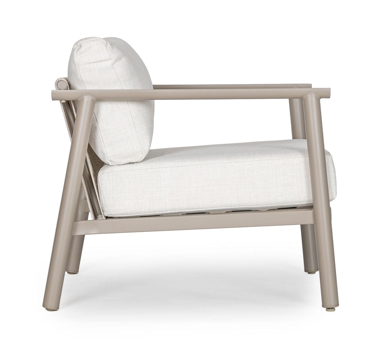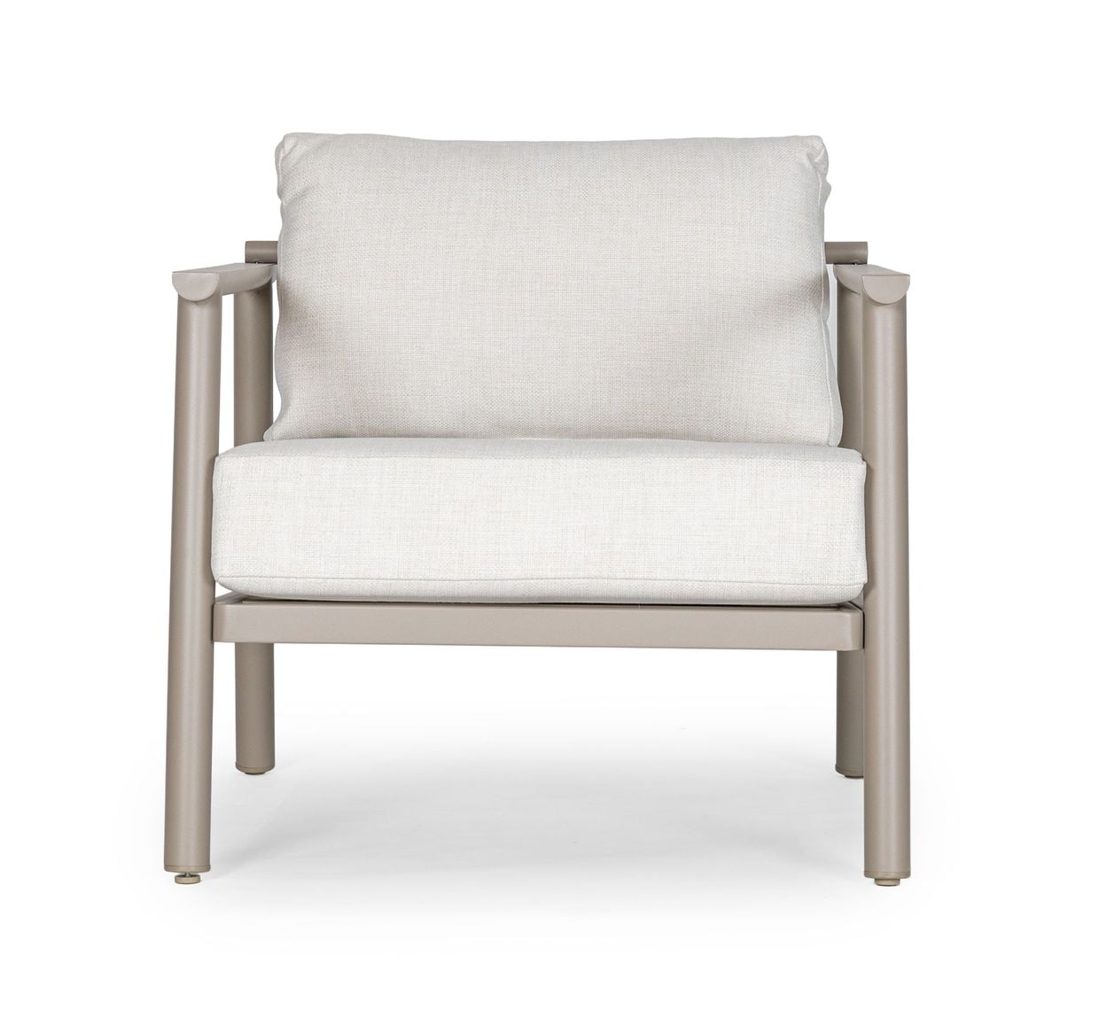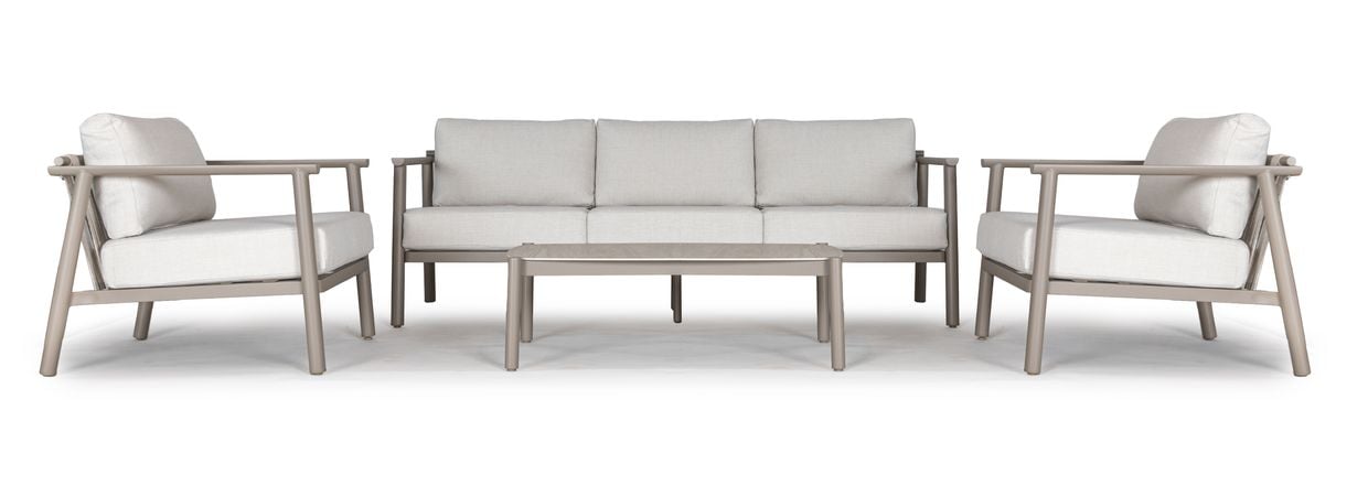Stommen är tillverkad i slitstarkt aluminium och lackerad i vår egen kulör Nordisk beige – en mjuk, varm nyans som gör det enkelt att kombinera soffgruppen med övriga möbler i samma kulör och skapa en enhetlig helhet.