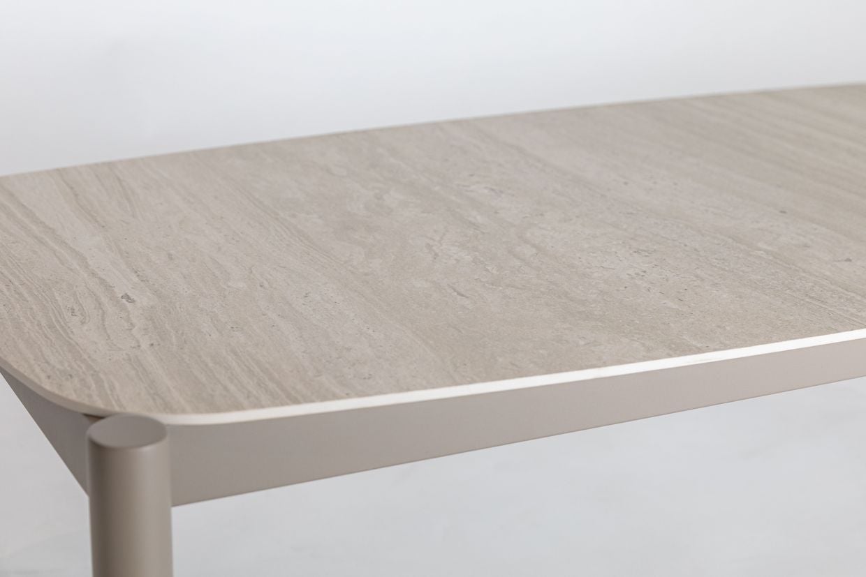 Till soffgruppen hör ett soffbord med en bordsskiva i sintered stone – ett exklusivt material med naturlig stenkaraktär som är mycket tåligt mot repor, värme och fläckar.