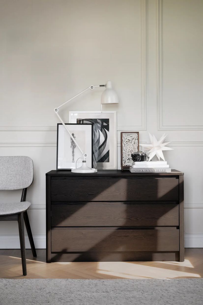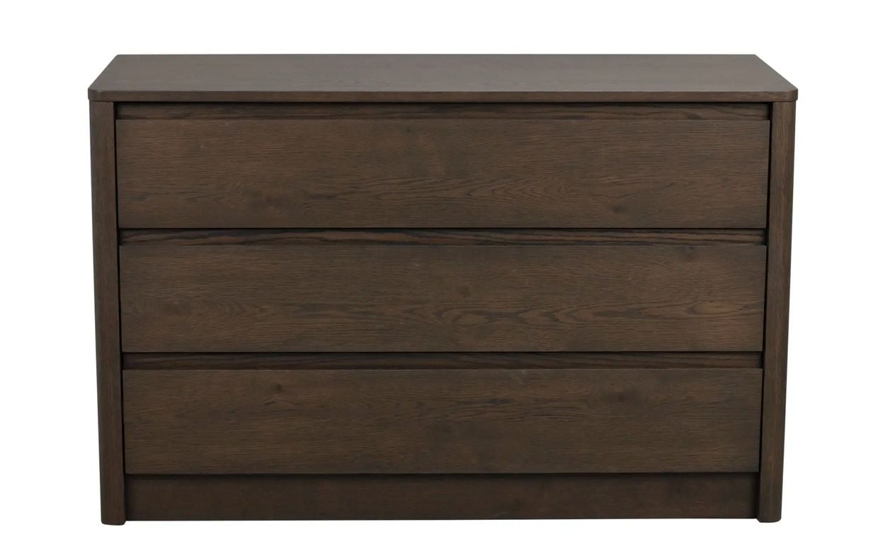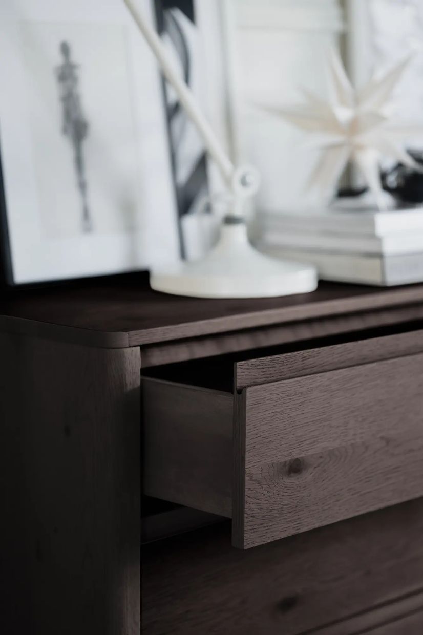 Melstone är en byrå i brunoljad FSC®-certifierad vildek med genomgående hantverkskänsla och mjuka former. Byrån har infrästa handtag i massivt trä, en detalj som både är funktionell och estetiskt tilltalande. Alla delar är fanerade med rundade kanter för ett mjukt och modernt uttryck, och byrån vilar på en upphöjd sarg som ger en lätt, svävande känsla. Den dolda mjukstängande funktionen på lådorna förstärker den genomarbetade känslan.