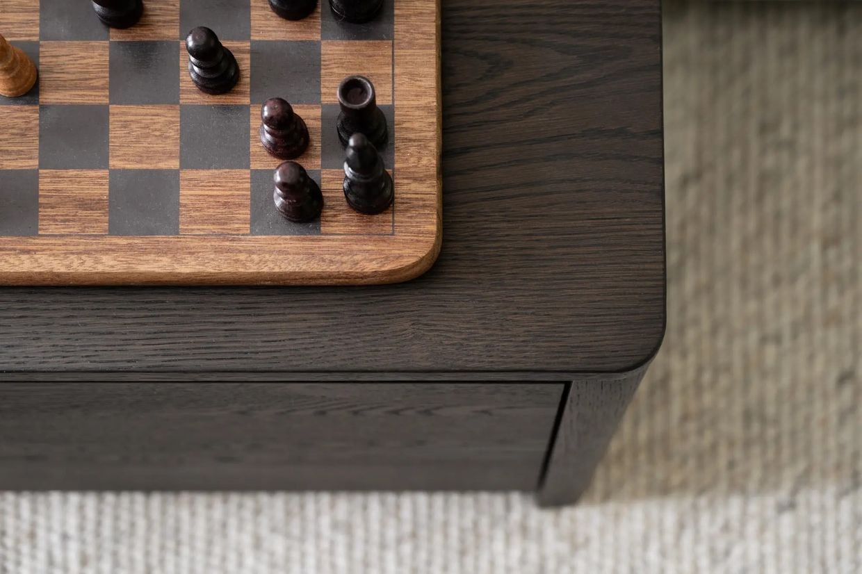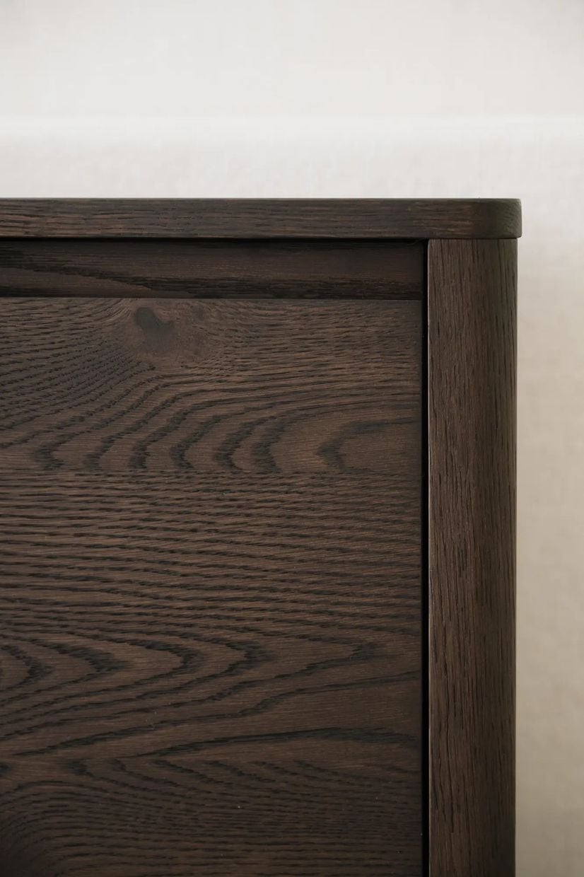 Det låga sideboardet i kollektionen Melstone kombinerar smart förvaring med ett elegant formspråk och fungerar lika bra som sittbänk i hallen som stilfull avlastningsyta i vardagsrummet. Tillverkat i brunoljad FSC®-certifierad vildek med vackra fanerade ytor och rundade hörn utstrålar möbeln värme och hantverkskänsla. Den sammanhängande träbilden i fronten skapas av en och samma planka från trädet över hela fronten, vilket ger ett harmoniskt och exklusivt uttryck. De infrästa handtagen i massivt trä smälter in sömlöst i designen. Sideboardet vilar på en upphöjd sarg som skapar ett lätt intryck trots sin robusta konstruktion.